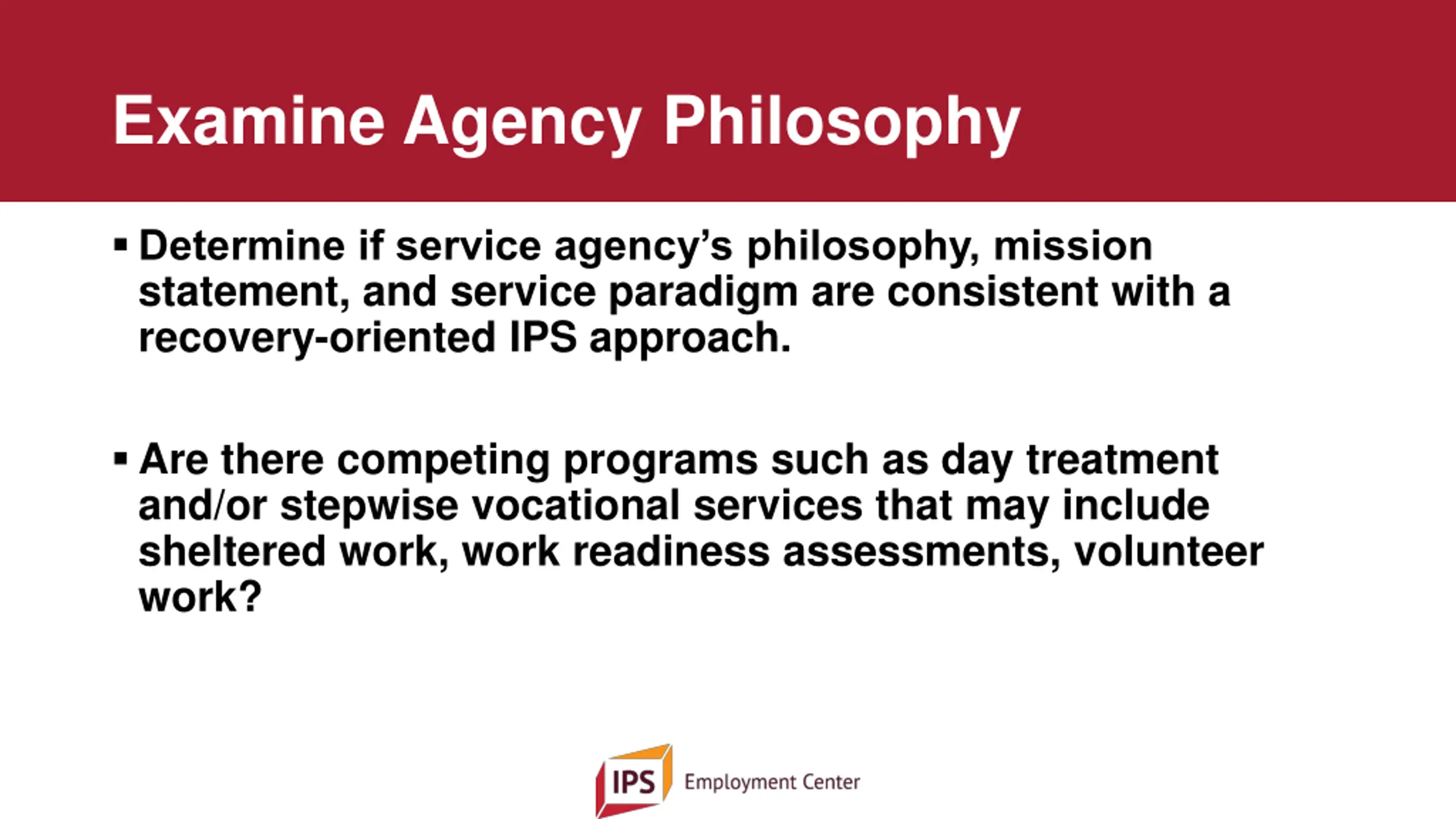 Examine Agency Philosophy Determine if service agency s philosophy, mission statement, and service paradigm are consistent with a recovery-oriented IPS approach. Are there competing programs such as day treatment and/or stepwise vocational services that may include sheltered work, work readiness assessments, volunteer work?