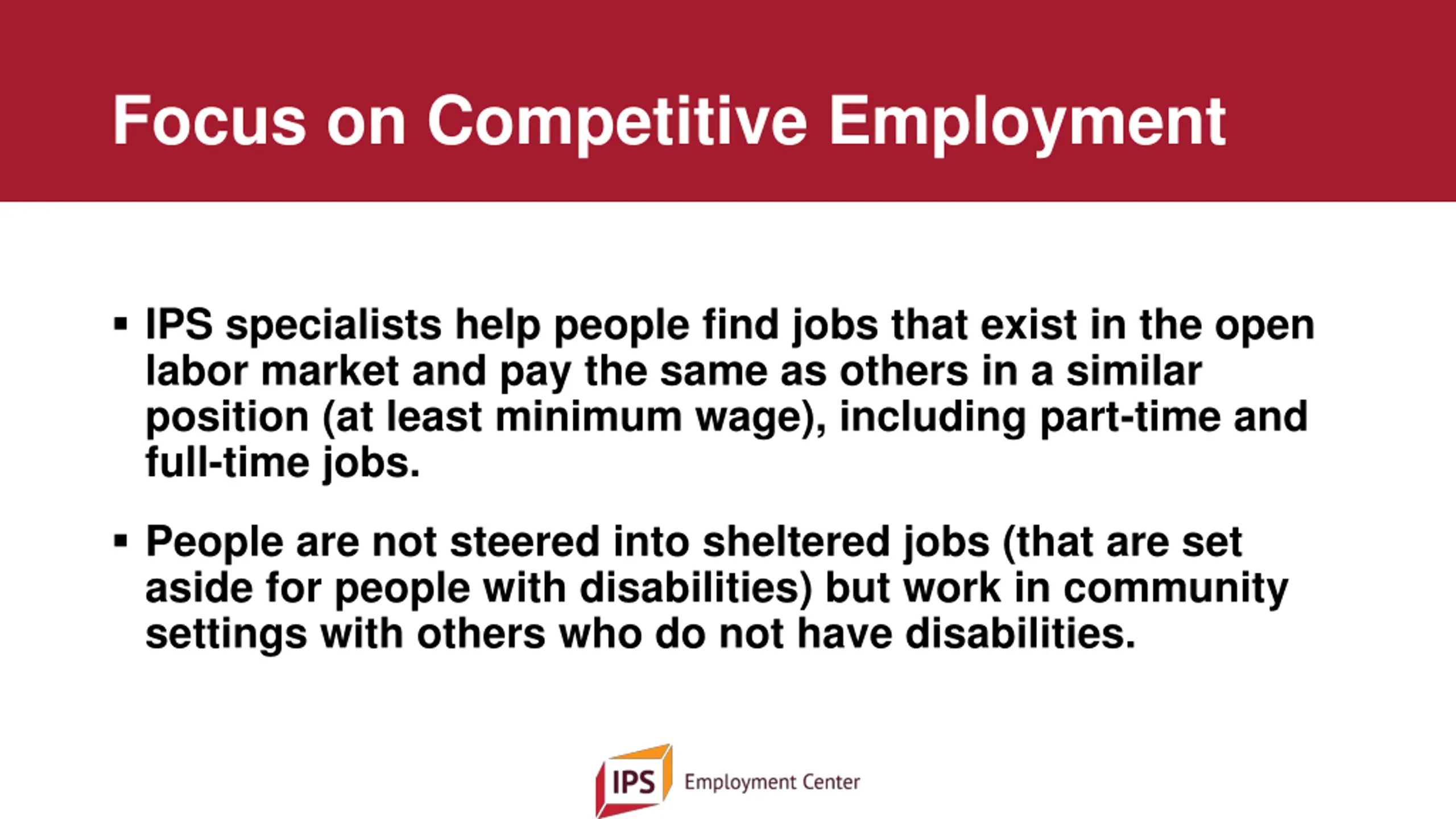 Focus on Competitive Employment IPS specialists help people find jobs that exist in the open labor market and pay the same as others in a similar position (at least minimum wage), including part-time and full-time jobs. People are not steered into sheltered jobs (that are set aside for people with disabilities) but work in community settings with others who do not have disabilities.