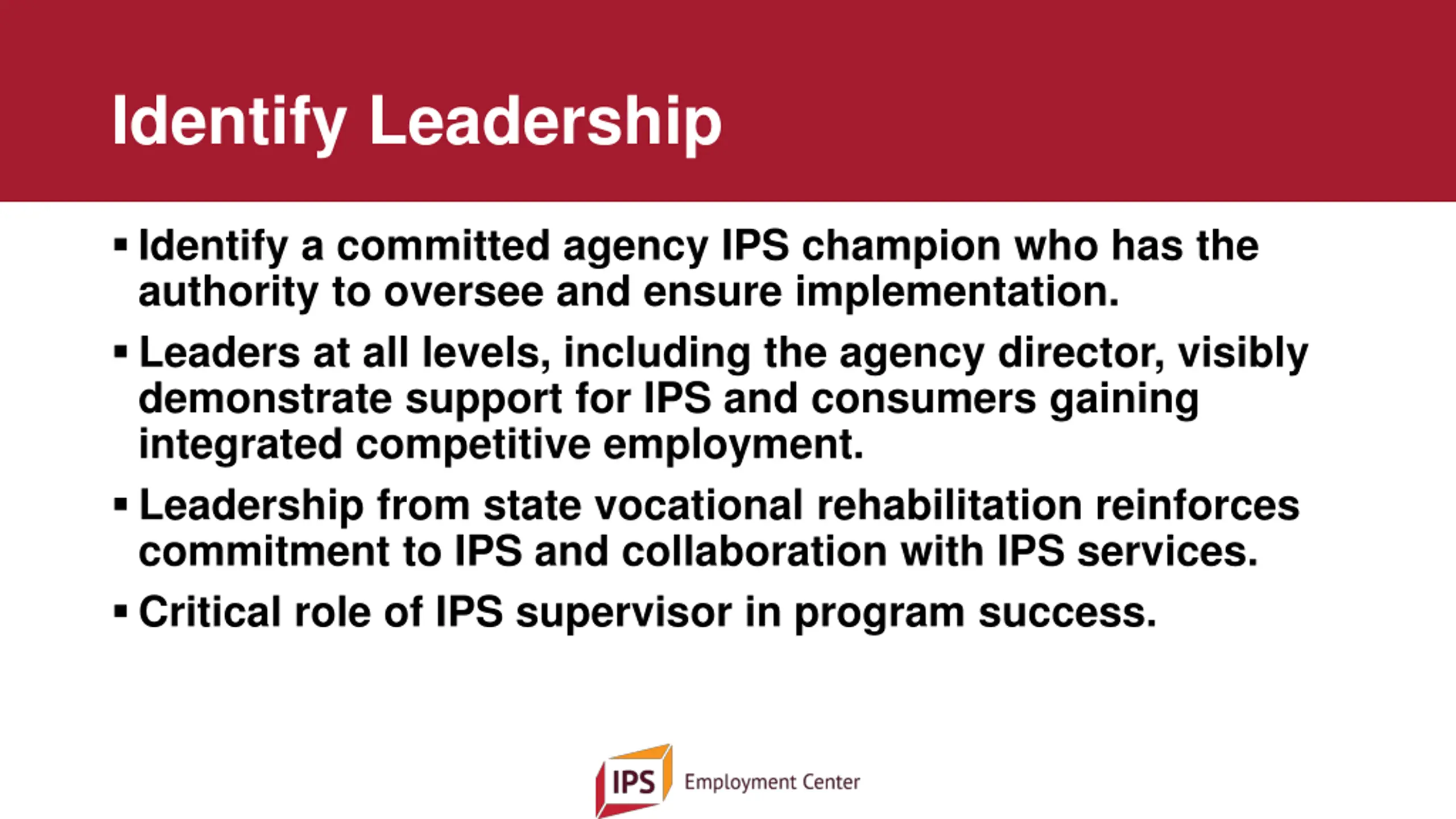 Identify Leadership Identify a committed agency IPS champion who has the authority to oversee and ensure implementation. Leaders at all levels, including the agency director, visibly demonstrate support for IPS and consumers gaining integrated competitive employment. Leadership from state vocational rehabilitation reinforces commitment to IPS and collaboration with IPS services. Critical role of IPS supervisor in program success.