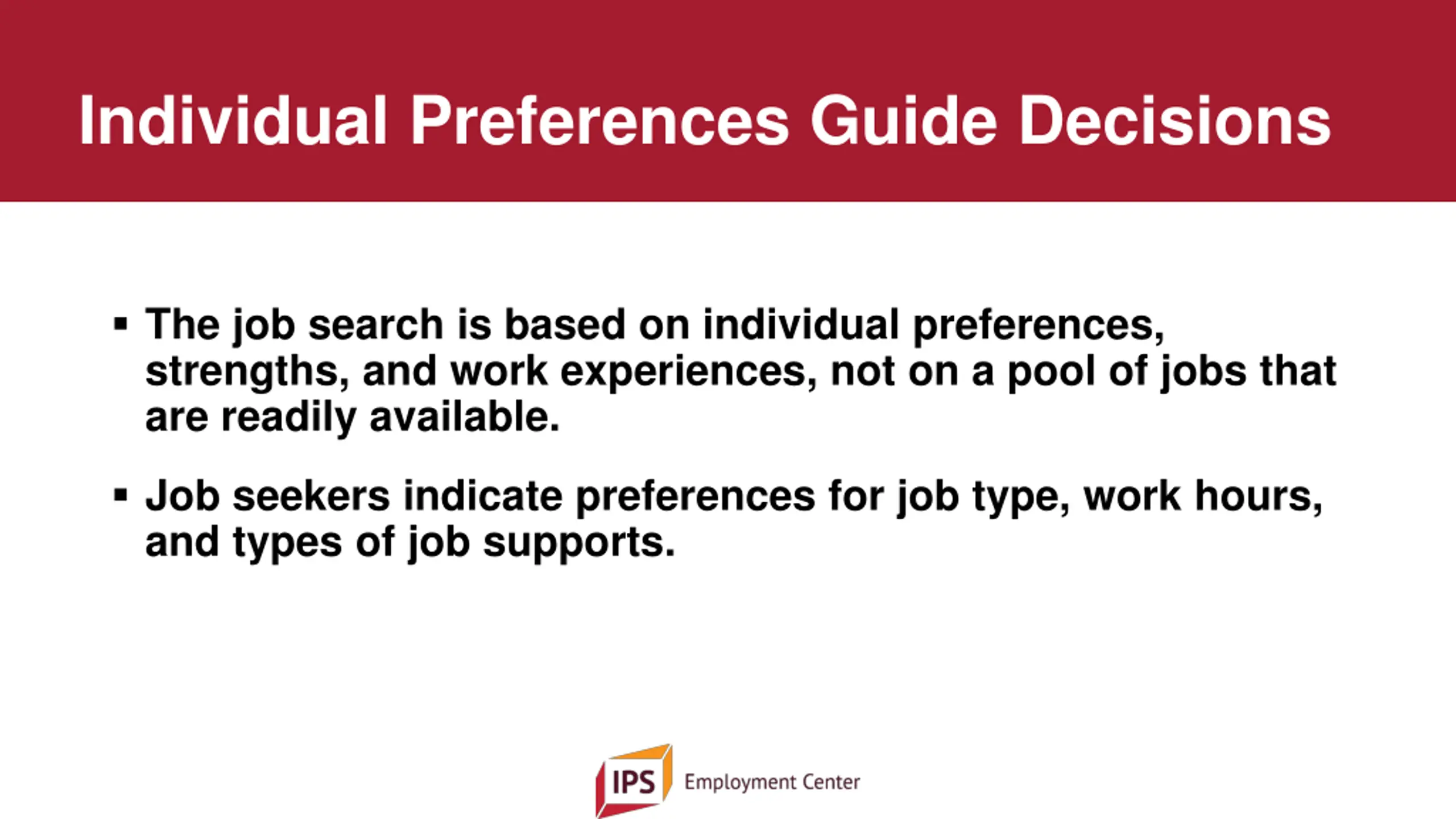 Individual Preferences Guide Decisions The job search is based on individual preferences, strengths, and work experiences, not on a pool of jobs that are readily available. Job seekers indicate preferences for job type, work hours, and types of job supports.