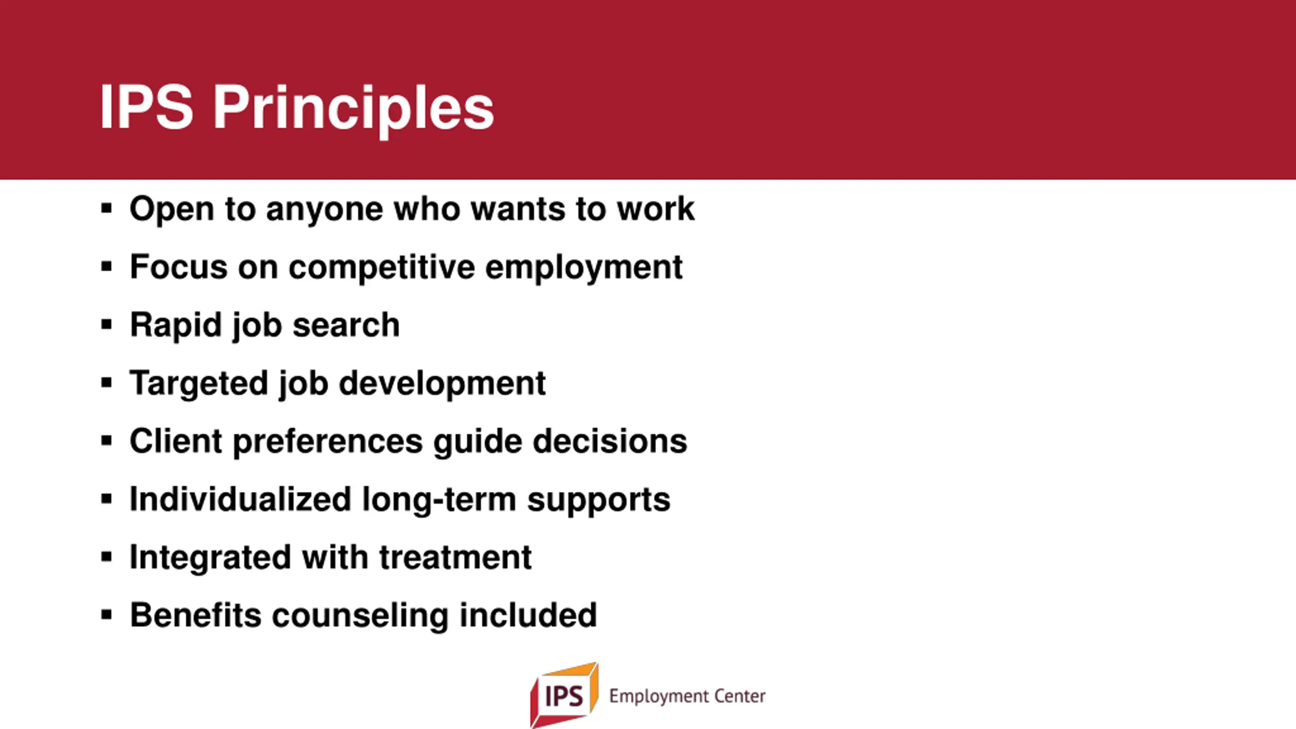 IPS Principles Open to anyone who wants to work Focus on competitive employment Rapid job search Targeted job development Client preferences guide decisions Individualized long-term supports Integrated with treatment Benefits counseling included