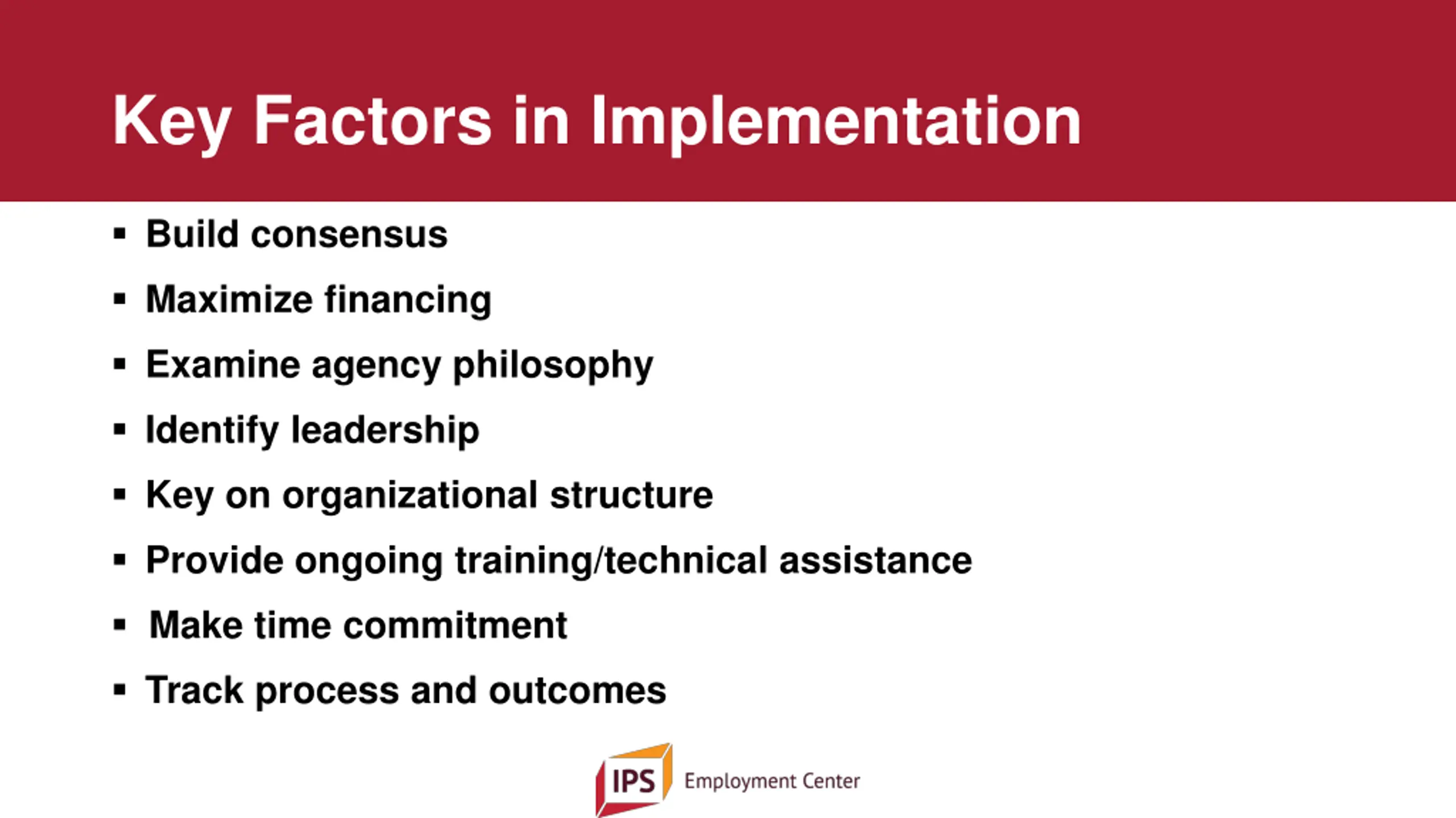 Maximize Funding Determine how IPS services can be funded Which funding sources pay for which parts of IPS? Explore funding (in the US) from Medicaid, state vocational rehabilitation funds, state mental health contracts and grants Approximately $5,000 per person in the first year and typically accruing limited costs thereafter (Salkever, 2013). Reallocate resources to IPS when feasible