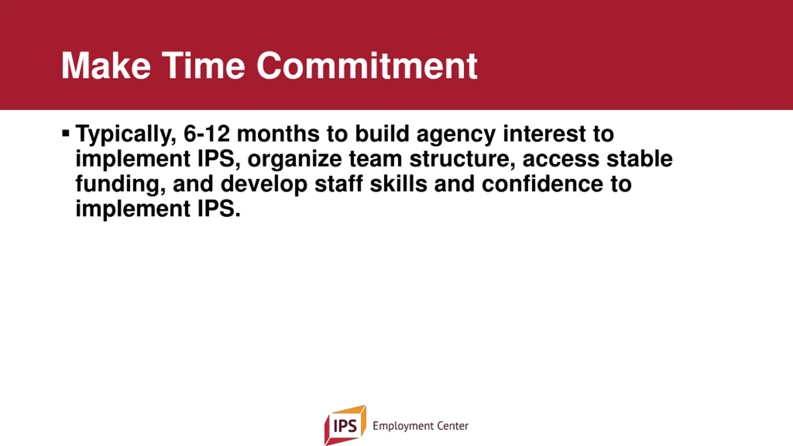 Make Time Commitment Typically, 6-12 months to build agency interest to implement IPS, organize team structure, access stable funding, and develop staff skills and confidence to implement IPS.