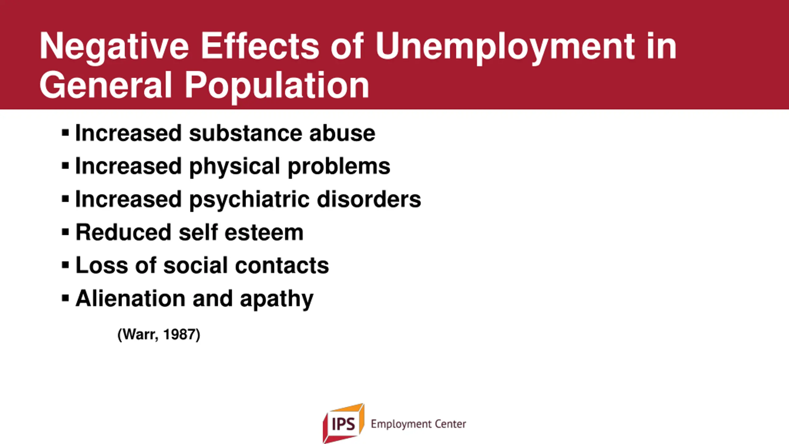 Negative Effects of Unemployment in General Population Increased substance abuse Increased physical problems Increased psychiatric disorders Reduced self esteem Loss of social contacts Alienation and apathy (Warr, 1987)
