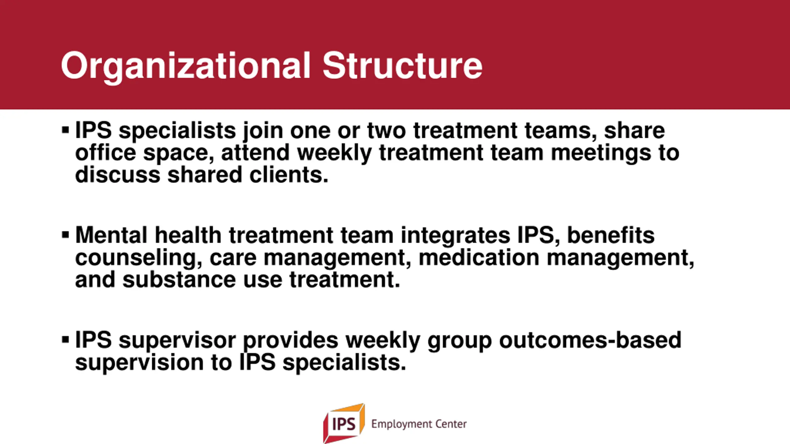 Organizational Structure IPS specialists join one or two treatment teams, share office space, attend weekly treatment team meetings to discuss shared clients. Mental health treatment team integrates IPS, benefits counseling, care management, medication management, and substance use treatment. IPS supervisor provides weekly group outcomes-based supervision to IPS specialists.