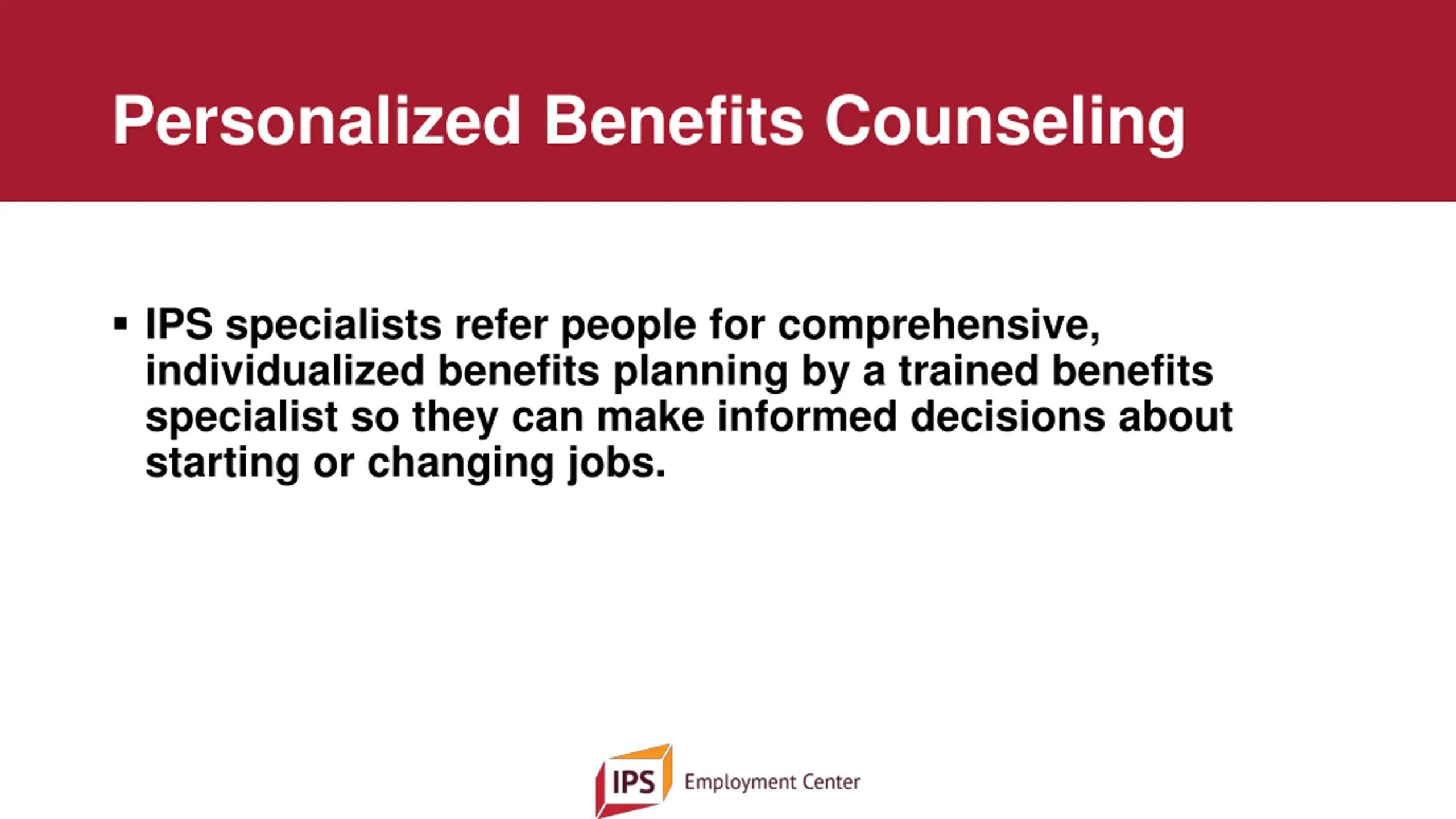 Personalized Benefits Counseling IPS specialists refer people for comprehensive, individualized benefits planning by a trained benefits specialist so they can make informed decisions about starting or changing jobs.