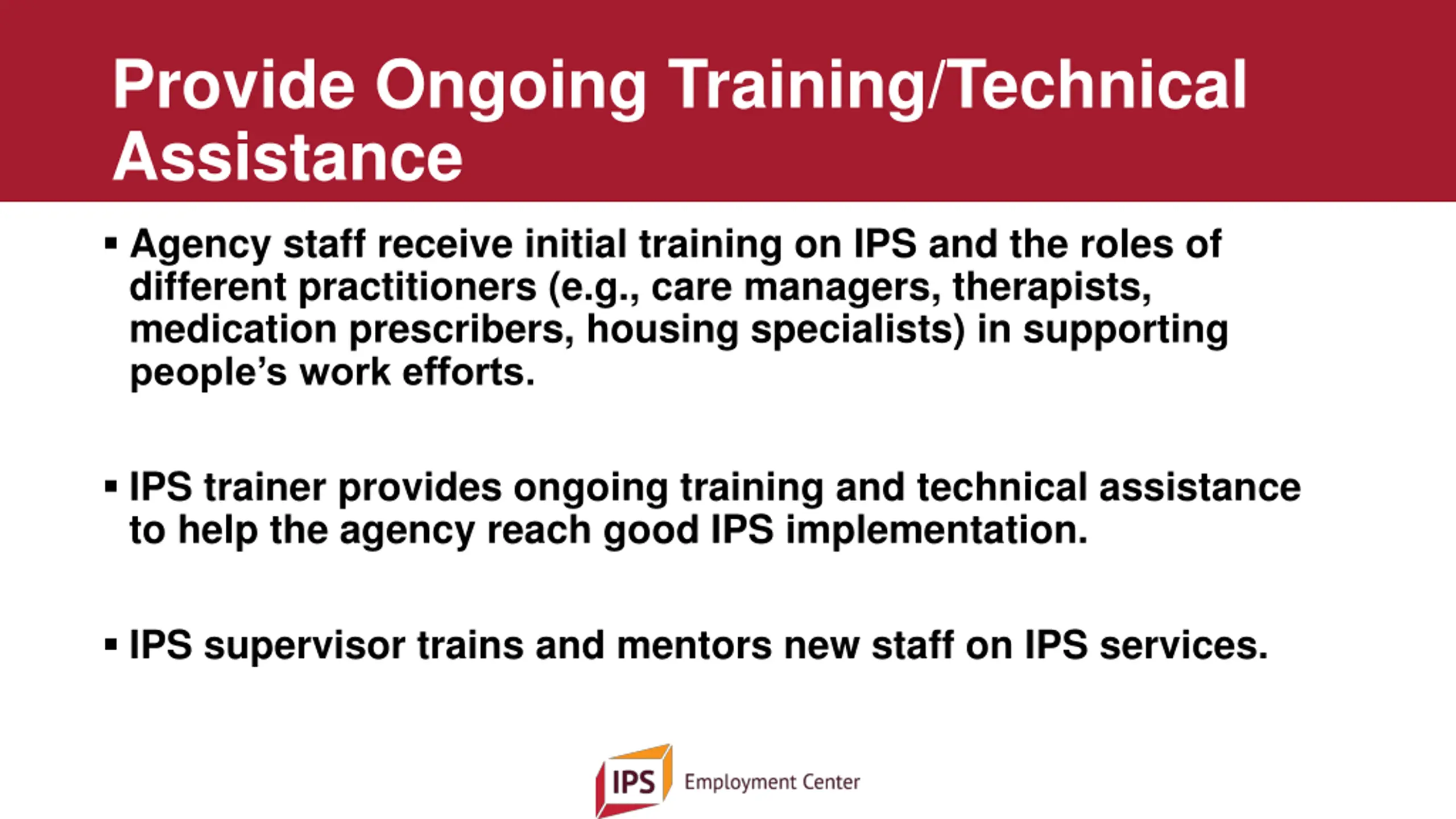 Provide Ongoing Training/Technical Assistance Agency staff receive initial training on IPS and the roles of different practitioners (e.g., care managers, therapists, medication prescribers, housing specialists) in supporting people s work efforts. IPS trainer provides ongoing training and technical assistance to help the agency reach good IPS implementation. IPS supervisor trains and mentors new staff on IPS services.