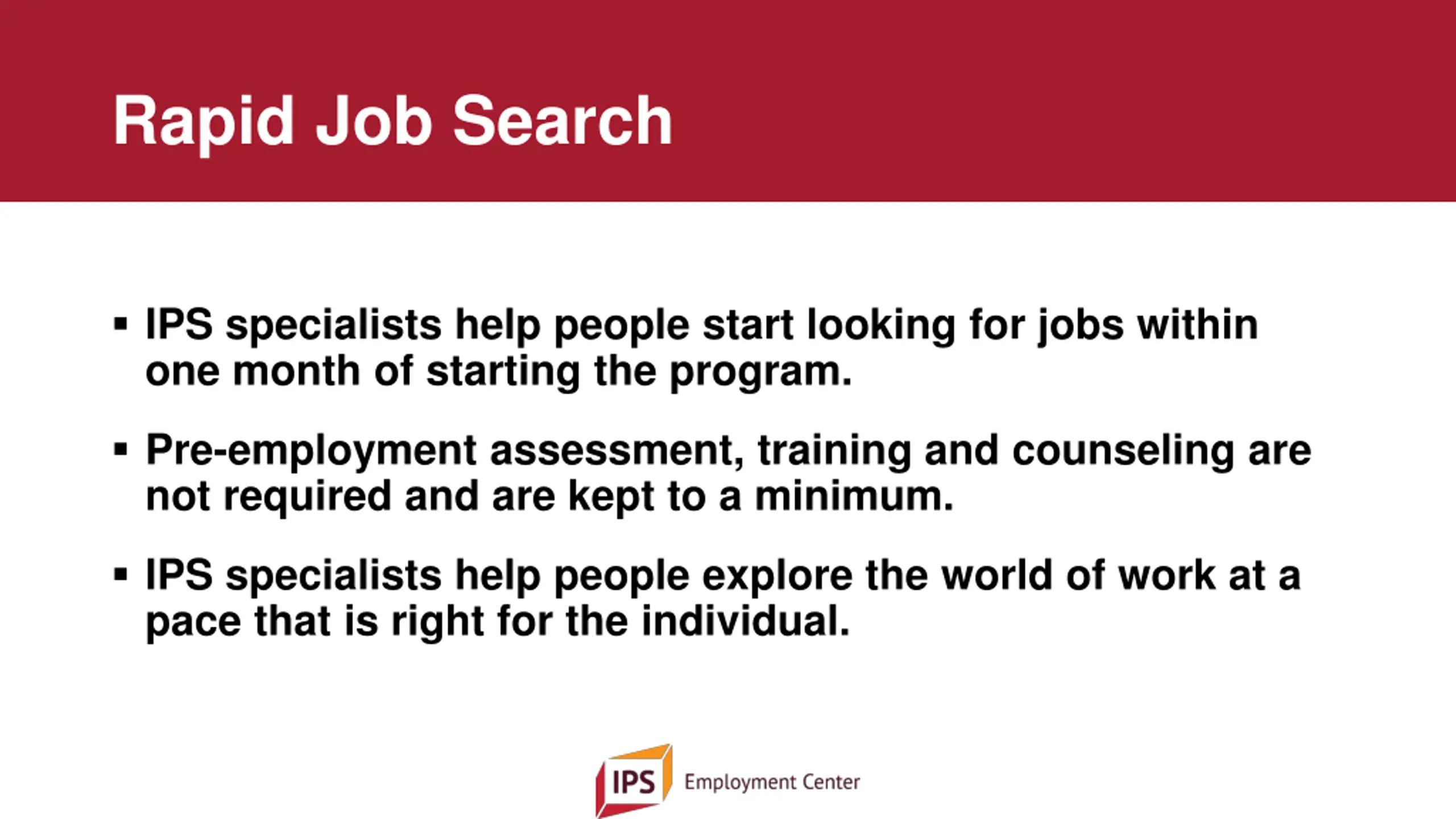 Rapid Job Search IPS specialists help people start looking for jobs within one month of starting the program. Pre-employment assessment, training and counseling are not required and are kept to a minimum. IPS specialists help people explore the world of work at a pace that is right for the individual.