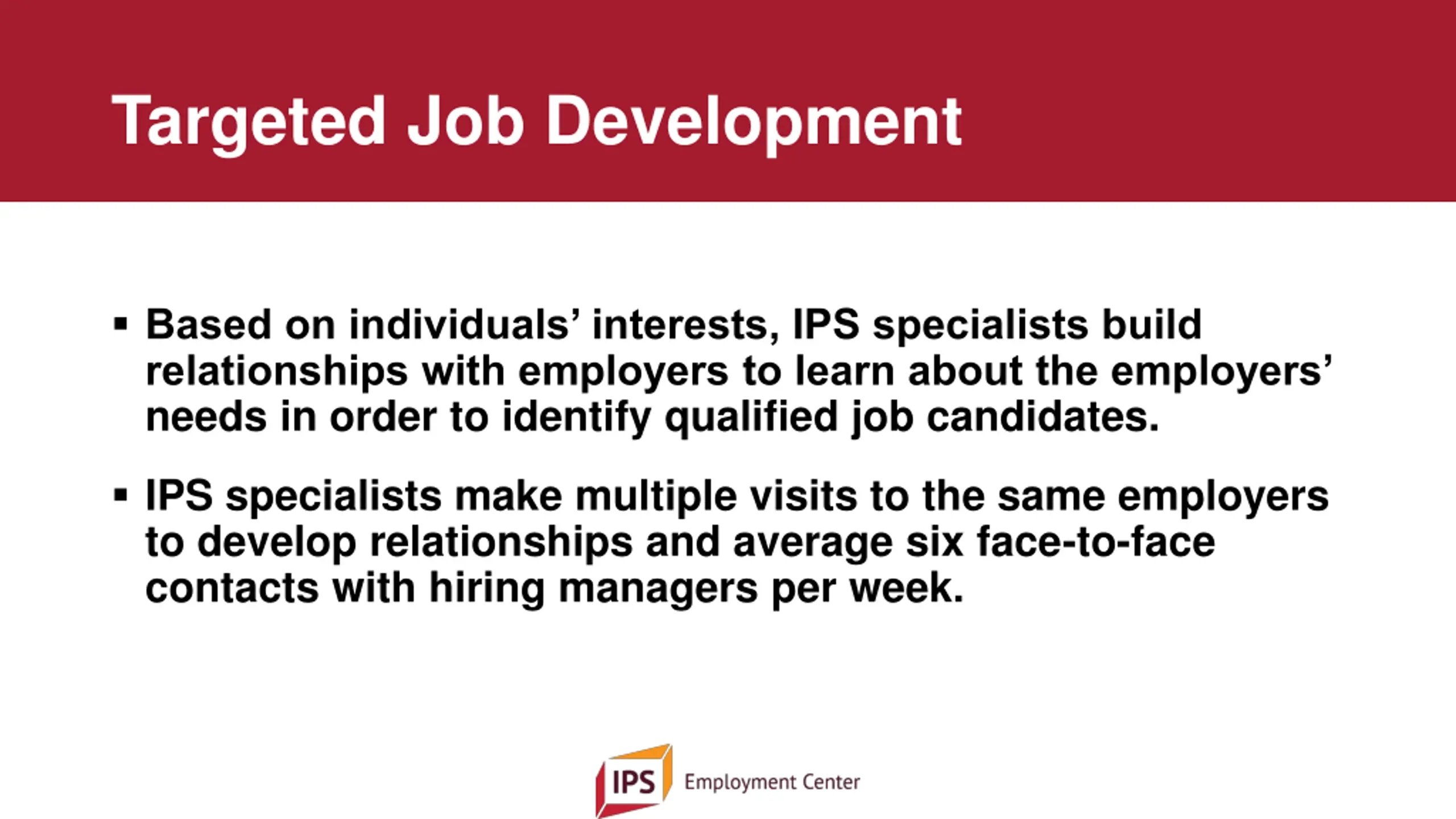 Targeted Job Development Based on individuals interests, IPS specialists build relationships with employers to learn about the employers needs in order to identify qualified job candidates. IPS specialists make multiple visits to the same employers to develop relationships and average six face-to-face contacts with hiring managers per week.