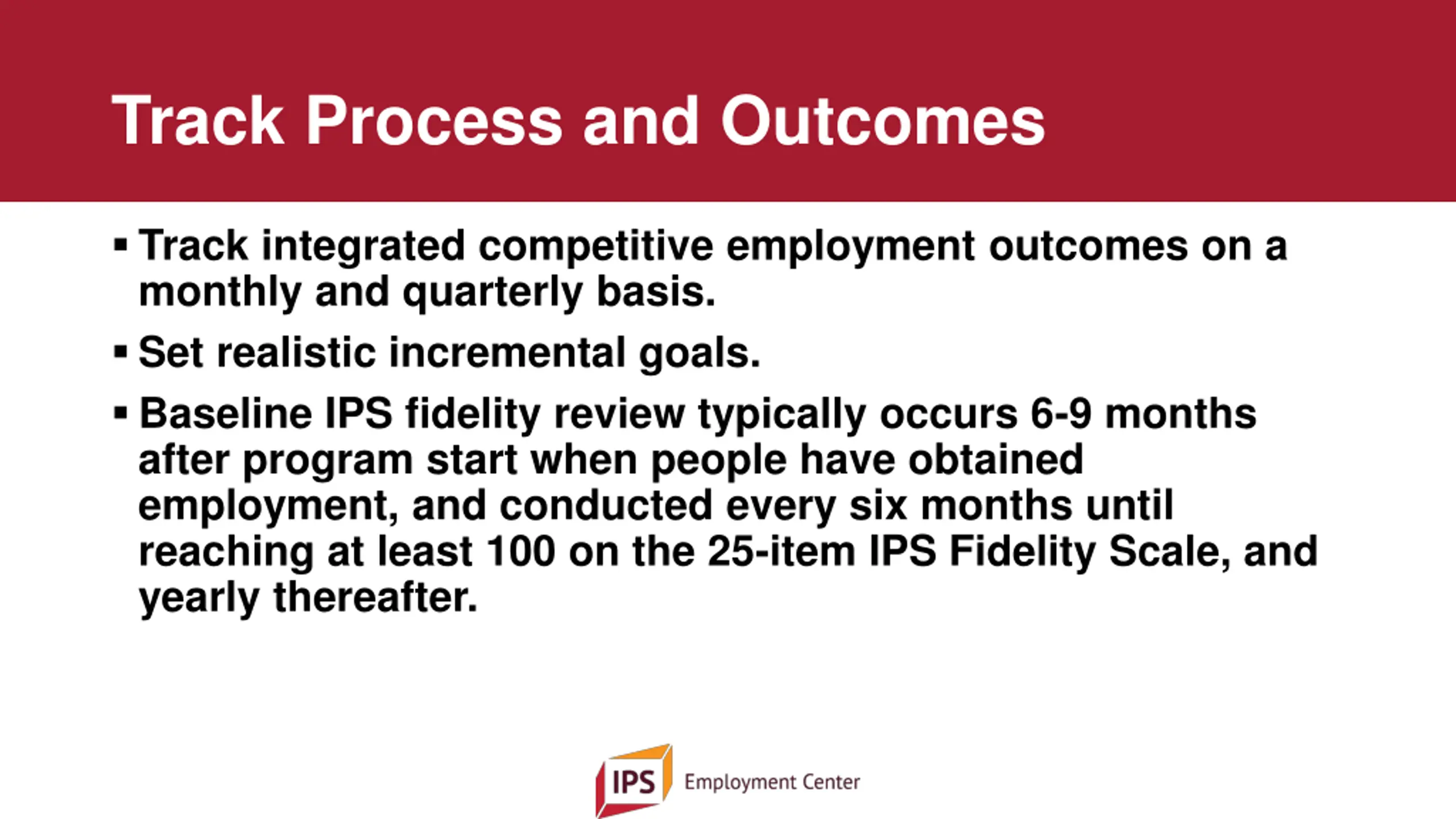 Track Process and Outcomes Track integrated competitive employment outcomes on a monthly and quarterly basis. Set realistic incremental goals. Baseline IPS fidelity review typically occurs 6-9 months after program start when people have obtained employment, and conducted every six months until reaching at least 100 on the 25-item IPS Fidelity Scale, and yearly thereafter.