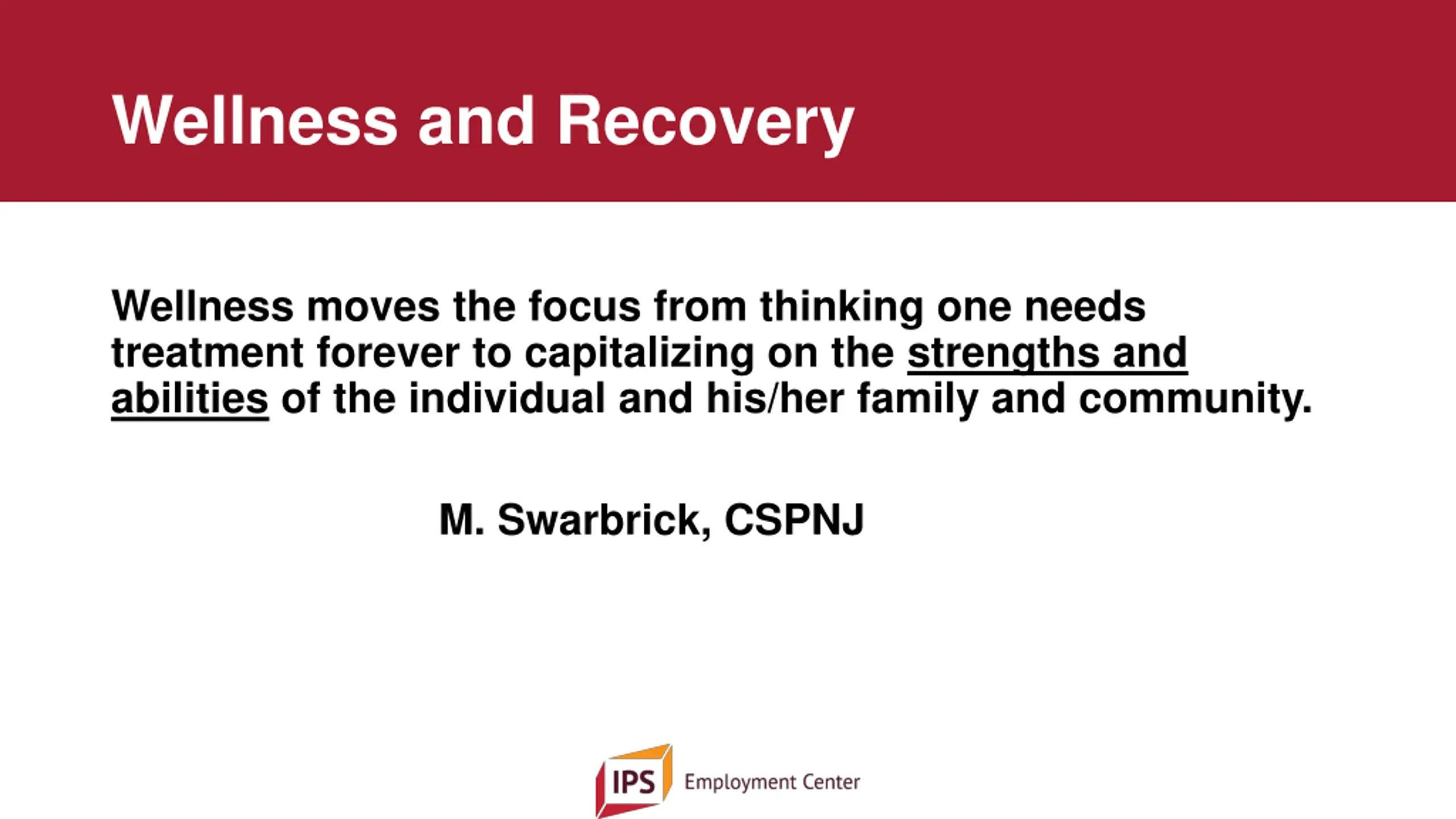 Wellness and Recovery Wellness moves the focus from thinking one needs treatment forever to capitalizing on the strengths and abilities of the individual and his/her family and community. M. Swarbrick, CSPNJ