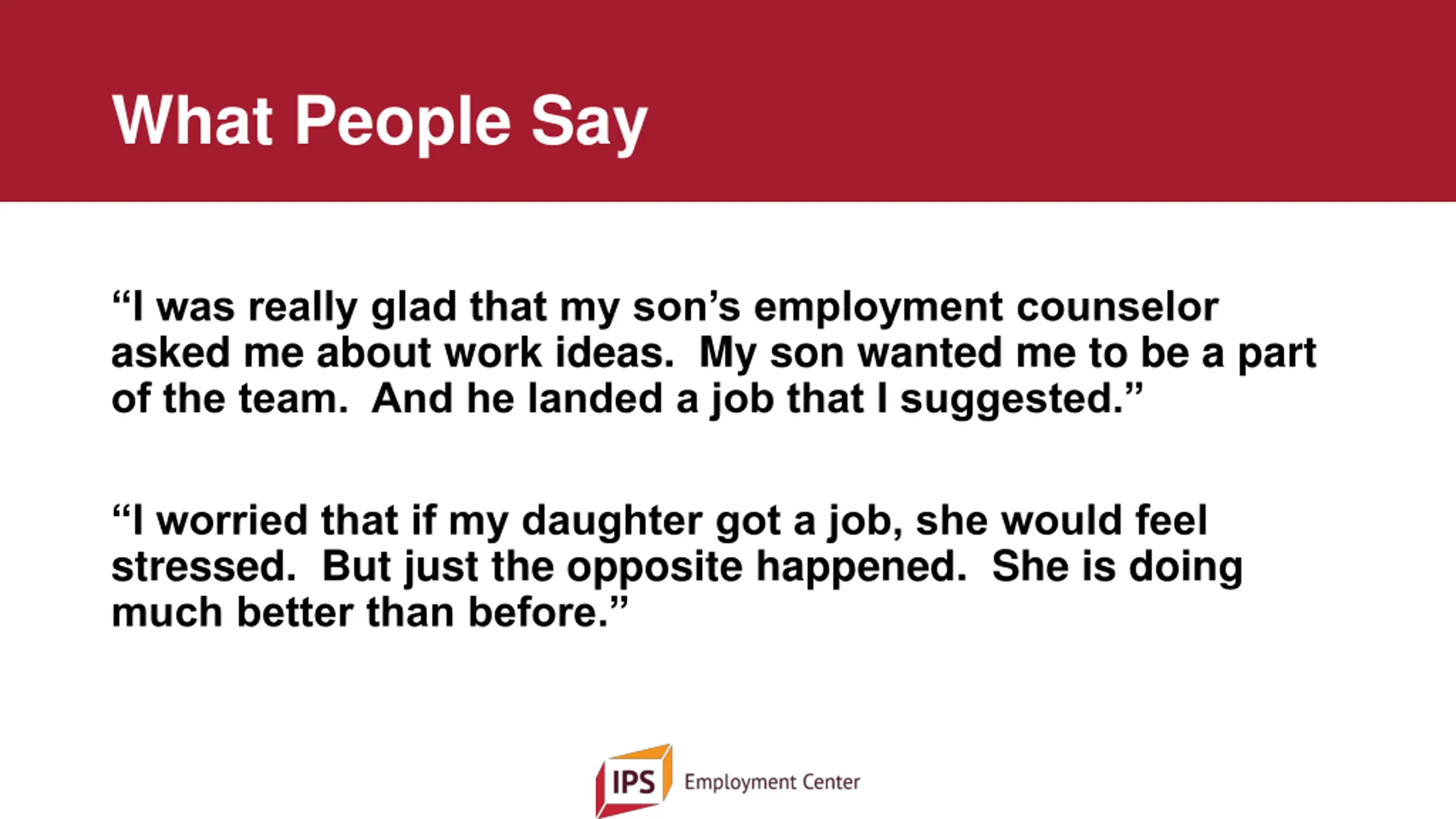 What People Say I was really glad that my son s employment counselor asked me about work ideas. My son wanted me to be a part of the team. And he landed a job that I suggested. I worried that if my daughter got a job, she would feel stressed. But just the opposite happened. She is doing much better than before.