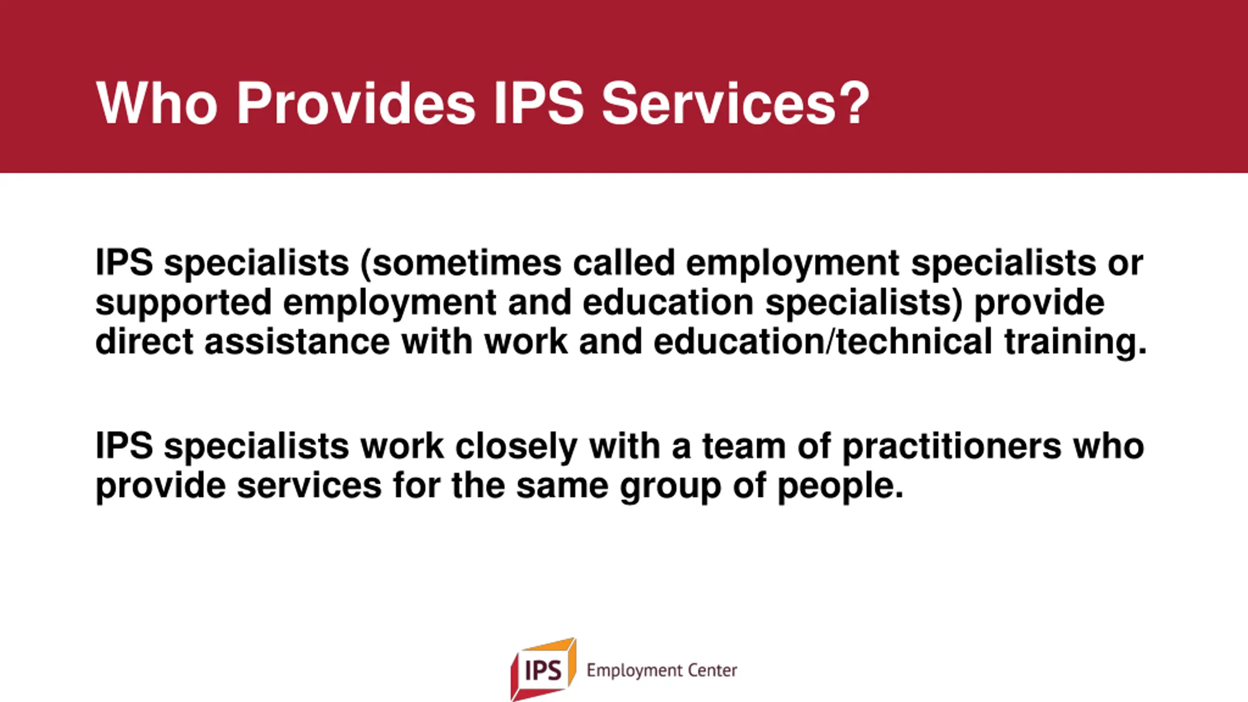Who Provides IPS Services? IPS specialists (sometimes called employment specialists or supported employment and education specialists) provide direct assistance with work and education/technical training. IPS specialists work closely with a team of practitioners who provide services for the same group of people.