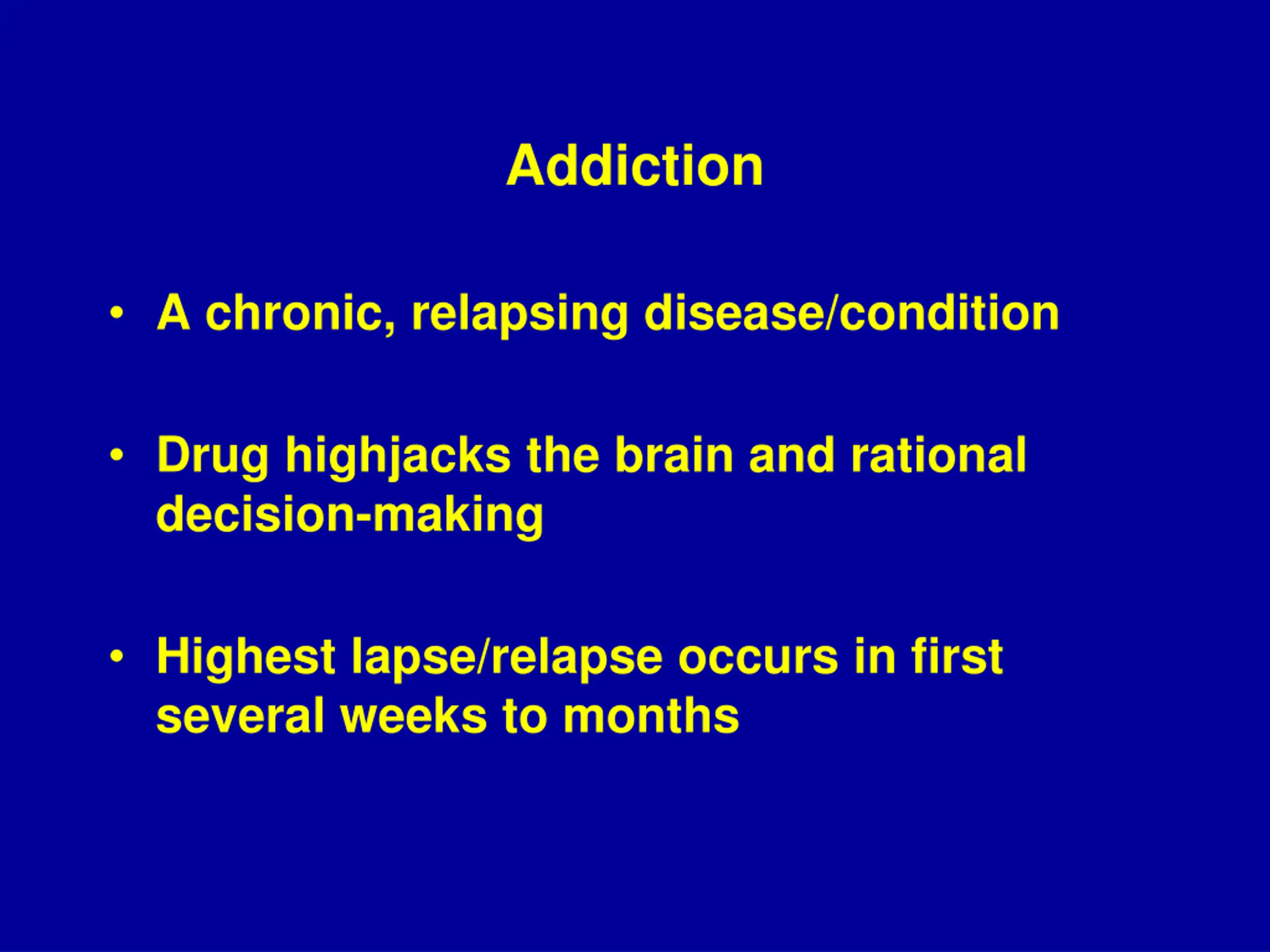 Addiction A chronic, relapsing disease/condition Drug highjacks the brain and rational decision-making Highest lapse/relapse occurs in first several weeks to months