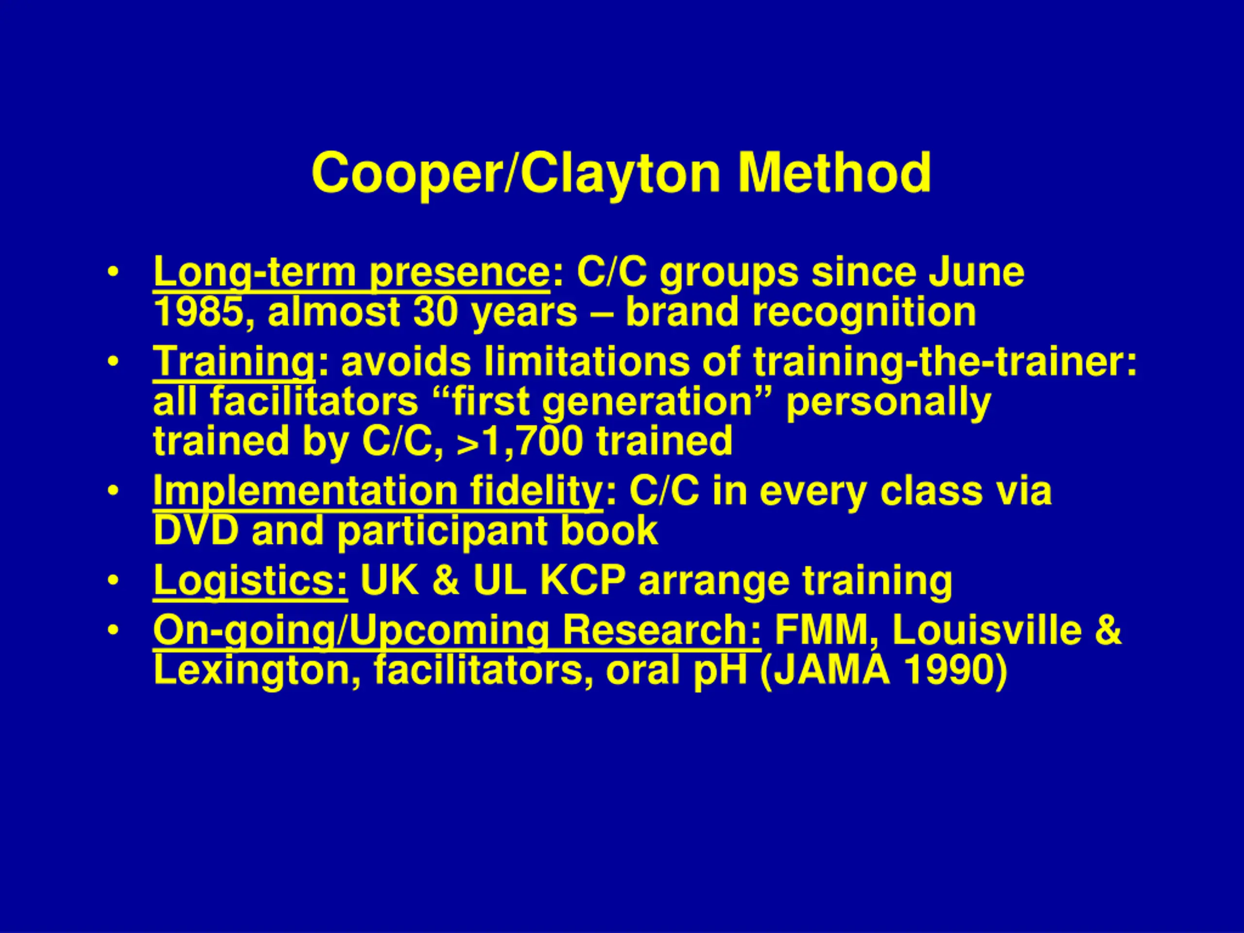 Cooper/Clayton Method Long-term presence: C/C groups since June 1985, almost 30 years brand recognition Training: avoids limitations of training-the-trainer: all facilitators first generation personally trained by C/C, >1,700 trained Implementation fidelity: C/C in every class via DVD and participant book Logistics: UK & UL KCP arrange training On-going/Upcoming Research: FMM, Louisville & Lexington, facilitators, oral pH (JAMA 1990)
