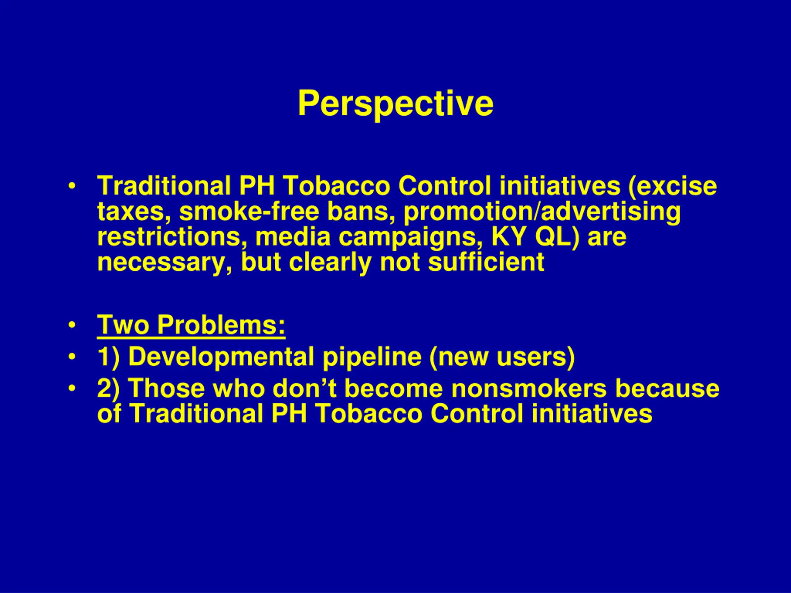 Perspective Traditional PH Tobacco Control initiatives (excise taxes, smoke-free bans, promotion/advertising restrictions, media campaigns, KY QL) are necessary, but clearly not sufficient Two Problems: 1) Developmental pipeline (new users) 2) Those who don t become nonsmokers because of Traditional PH Tobacco Control initiatives