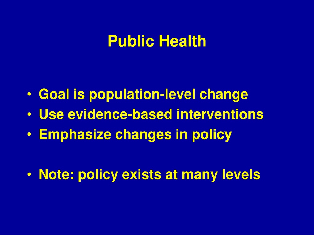 Public Health Goal is population-level change Use evidence-based interventions Emphasize changes in policy Note: policy exists at many levels