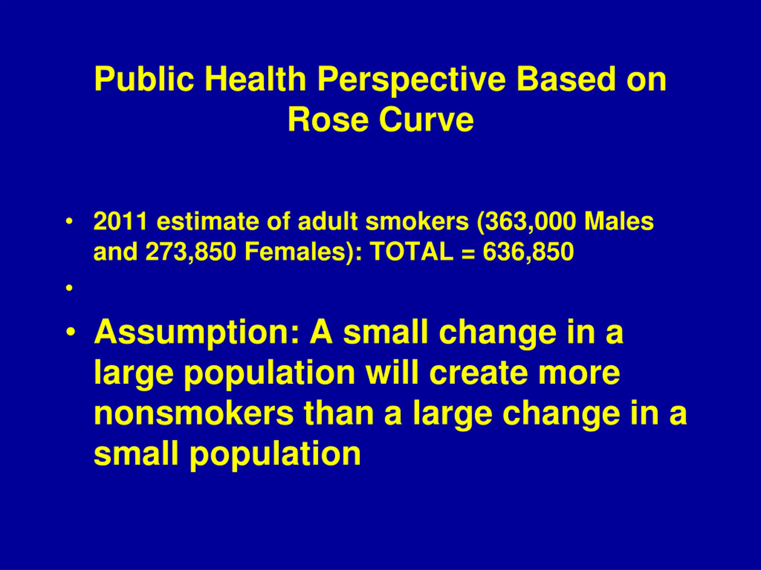 Public Health Perspective Based on Rose Curve 2011 estimate of adult smokers (363,000 Males and 273,850 Females): TOTAL = 636,850 Assumption: A small change in a large population will create more nonsmokers than a large change in a small population