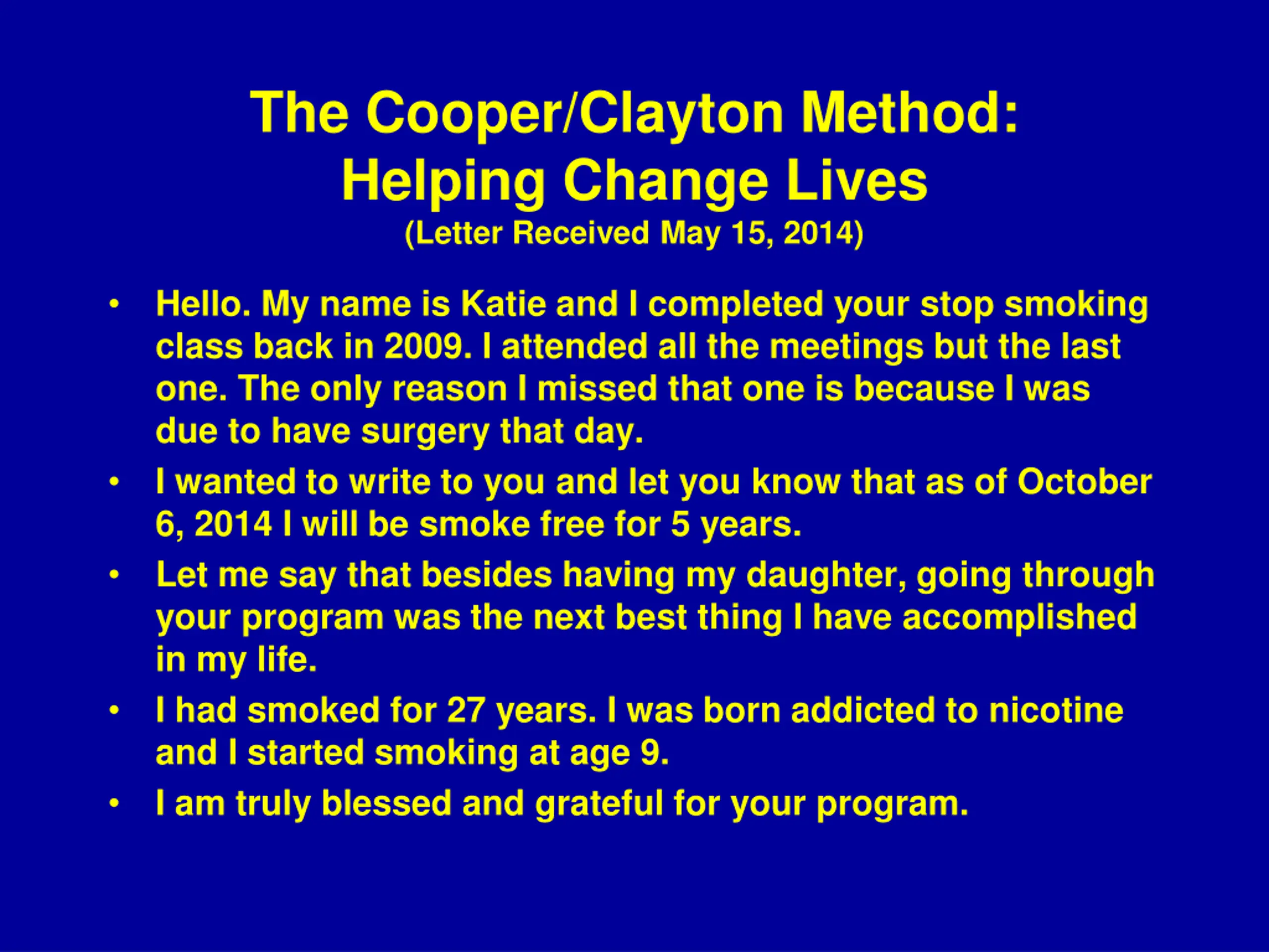 The Cooper/Clayton Method: Helping Change Lives (Letter Received May 15, 2014) Hello. My name is Katie and I completed your stop smoking class back in 2009. I attended all the meetings but the last one. The only reason I missed that one is because I was due to have surgery that day. I wanted to write to you and let you know that as of October 6, 2014 I will be smoke free for 5 years. Let me say that besides having my daughter, going through your program was the next best thing I have accomplished in my life. I had smoked for 27 years. I was born addicted to nicotine and I started smoking at age 9. I am truly blessed and grateful for your program.
