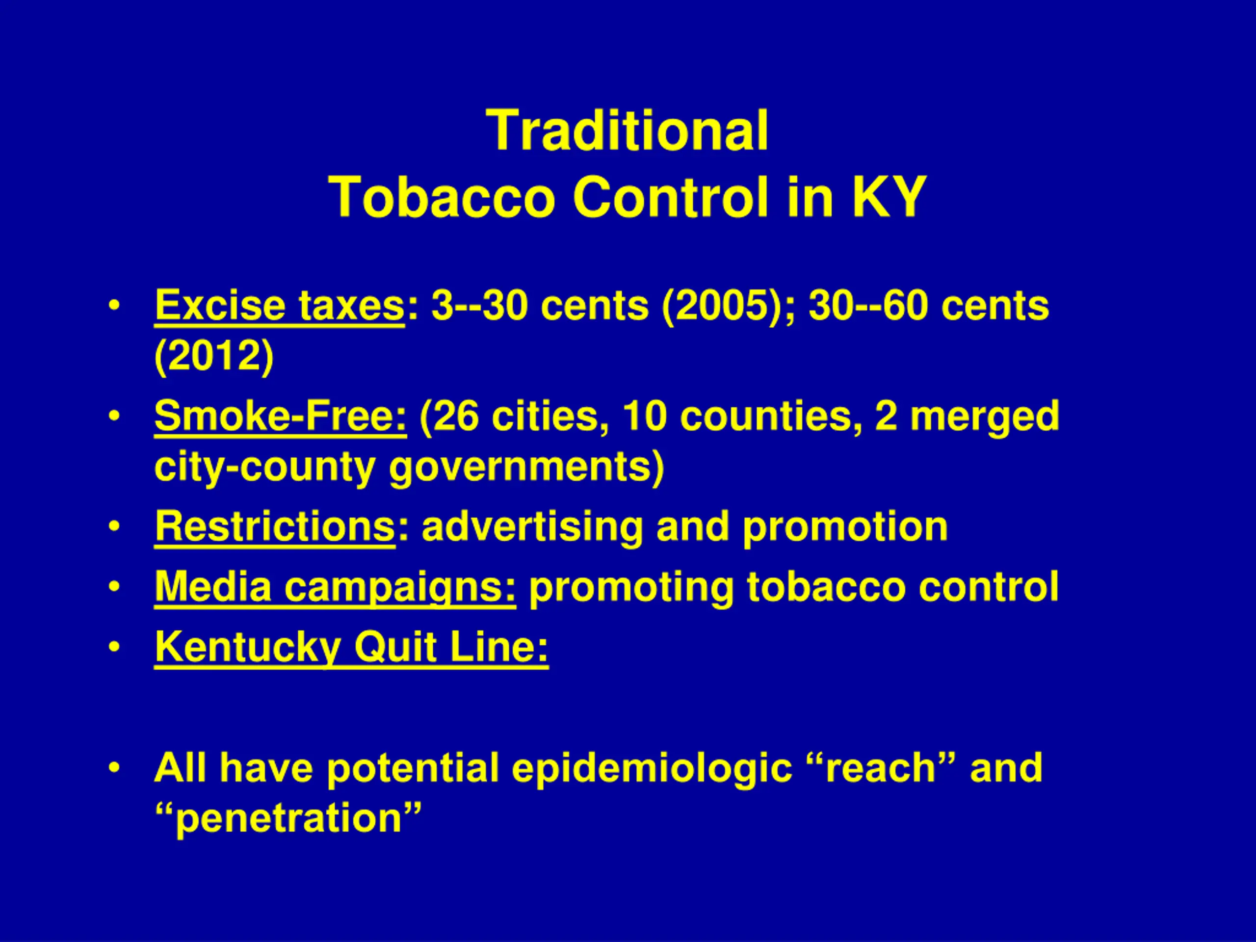 Traditional Tobacco Control in KY Excise taxes: 3--30 cents (2005); 30--60 cents (2012) Smoke-Free: (26 cities, 10 counties, 2 merged city-county governments) Restrictions: advertising and promotion Media campaigns: promoting tobacco control Kentucky Quit Line: All have potential epidemiologic reach and penetration