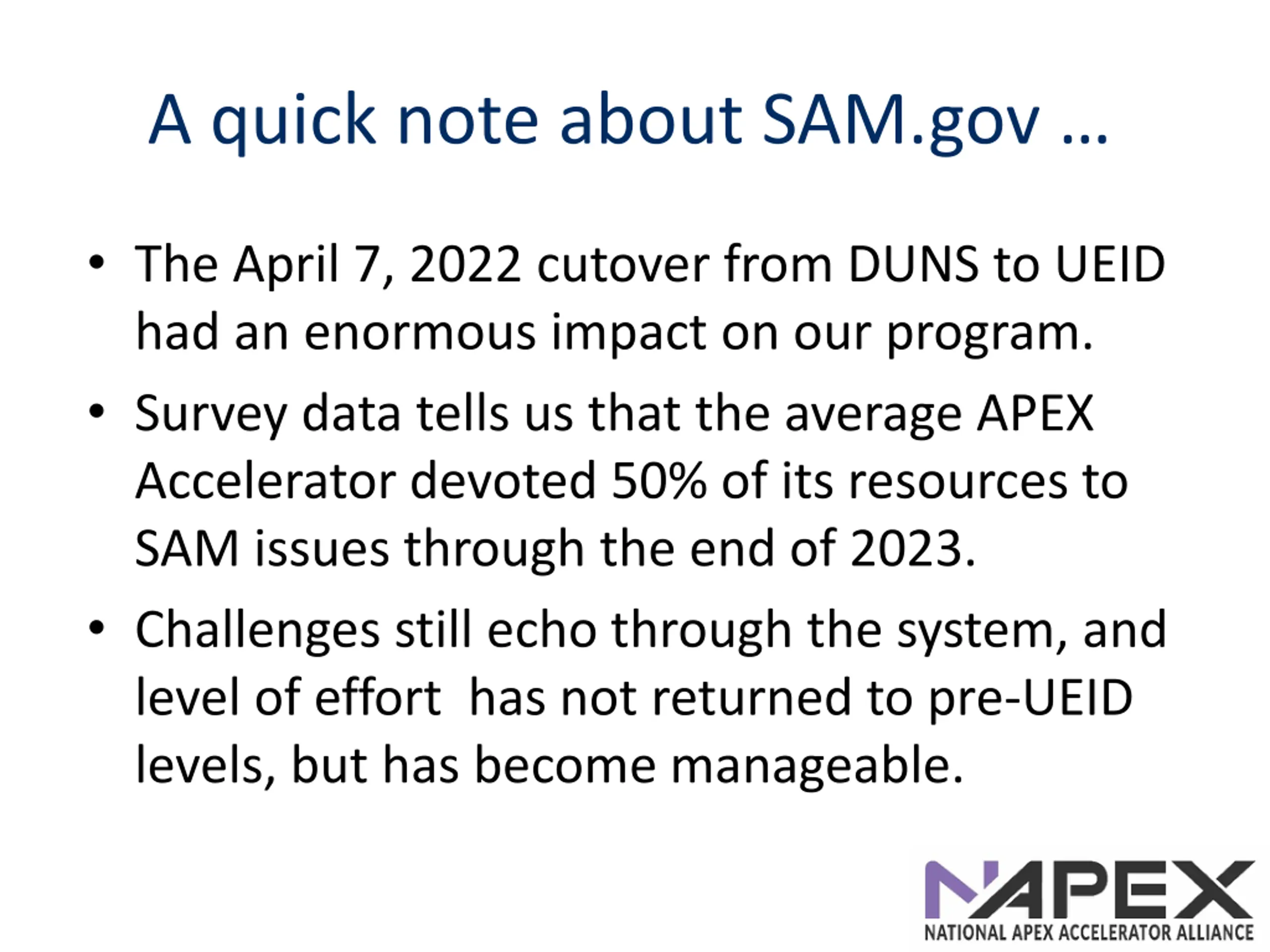 A quick note about SAM.gov The April 7, 2022 cutover from DUNS to UEID had an enormous impact on our program. Survey data tells us that the average APEX Accelerator devoted 50% of its resources to SAM issues through the end of 2023. Challenges still echo through the system, and level of effort has not returned to pre-UEID levels, but has become manageable.