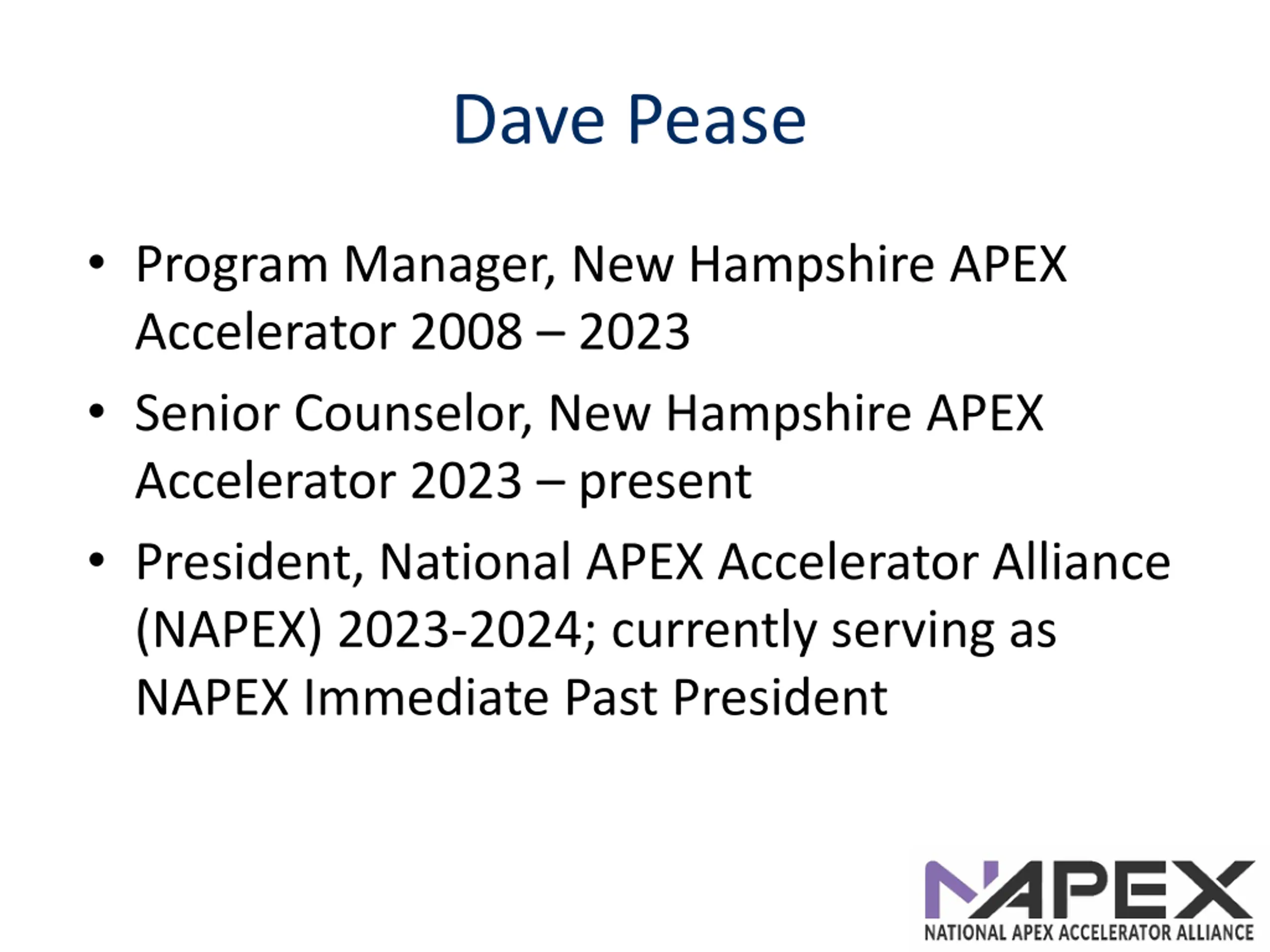 Dave Pease Program Manager, New Hampshire APEX Accelerator 2008 2023 Senior Counselor, New Hampshire APEX Accelerator 2023 present President, National APEX Accelerator Alliance (NAPEX) 2023-2024; currently serving as NAPEX Immediate Past President