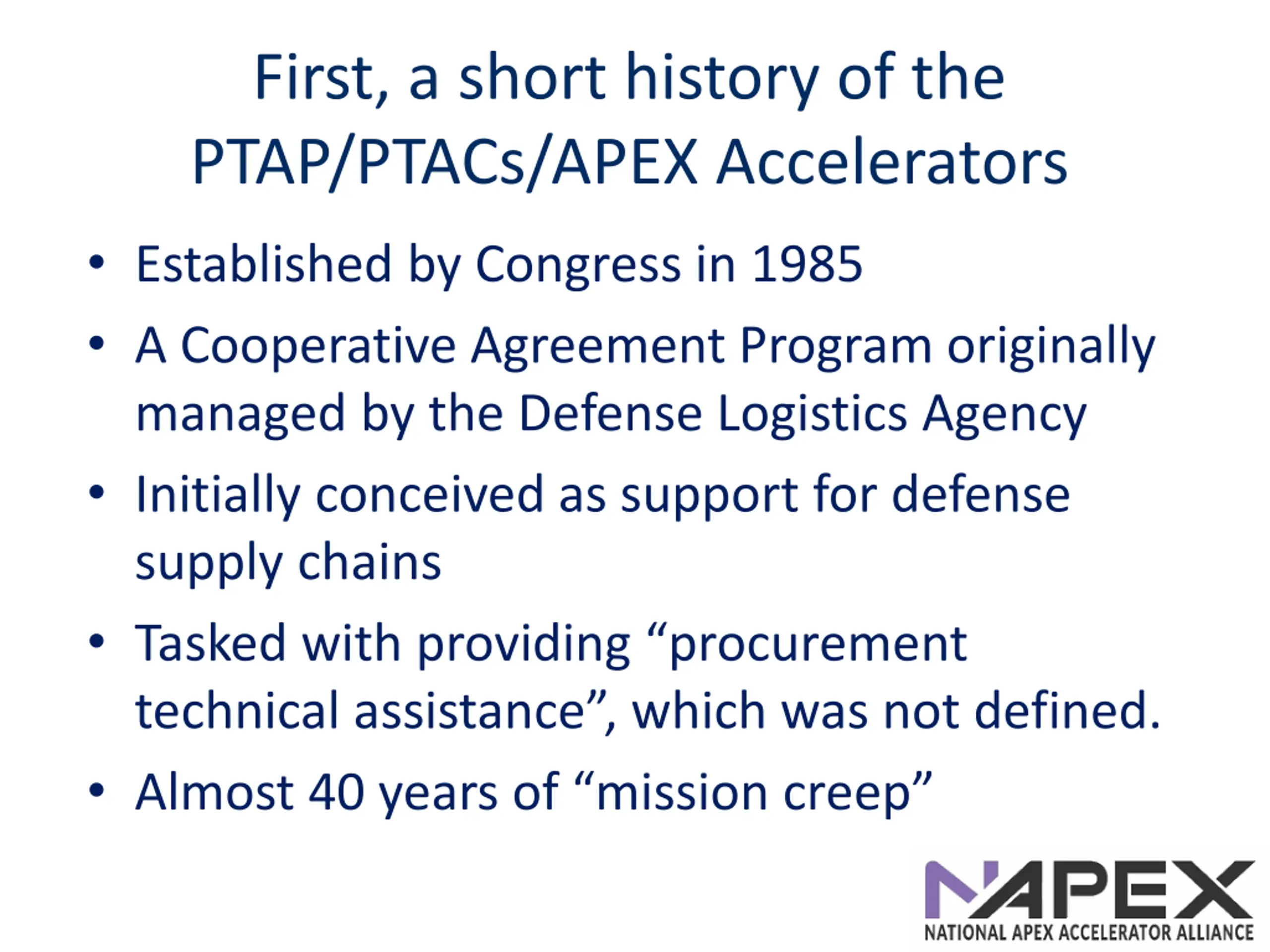 First, a short history of the PTAP/PTACs/APEX Accelerators Established by Congress in 1985 A Cooperative Agreement Program originally managed by the Defense Logistics Agency Initially conceived as support for defense supply chains Tasked with providing procurement technical assistance , which was not defined. Almost 40 years of mission creep