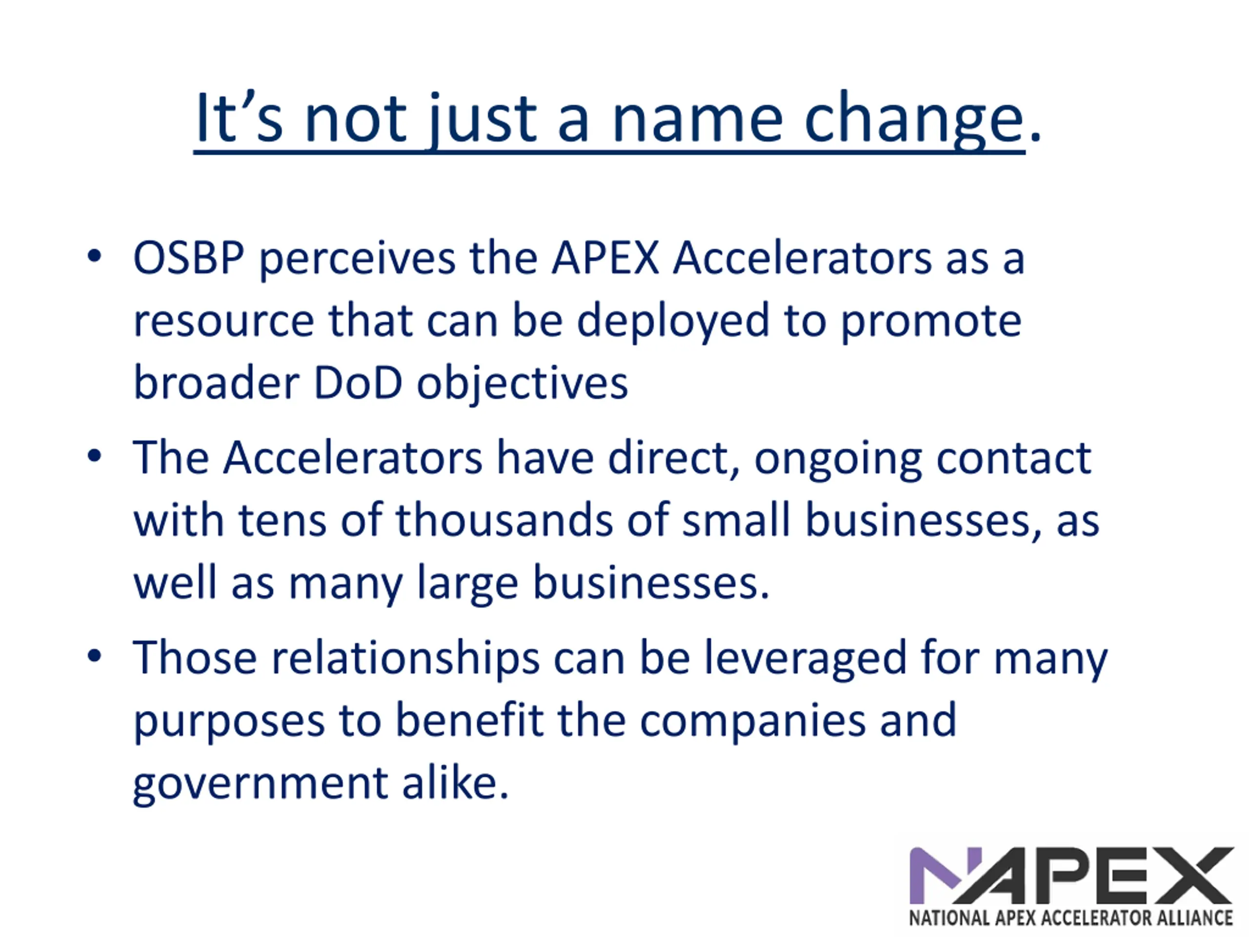 Its not just a name change. OSBP perceives the APEX Accelerators as a resource that can be deployed to promote broader DoD objectives The Accelerators have direct, ongoing contact with tens of thousands of small businesses, as well as many large businesses. Those relationships can be leveraged for many purposes to benefit the companies and government alike.