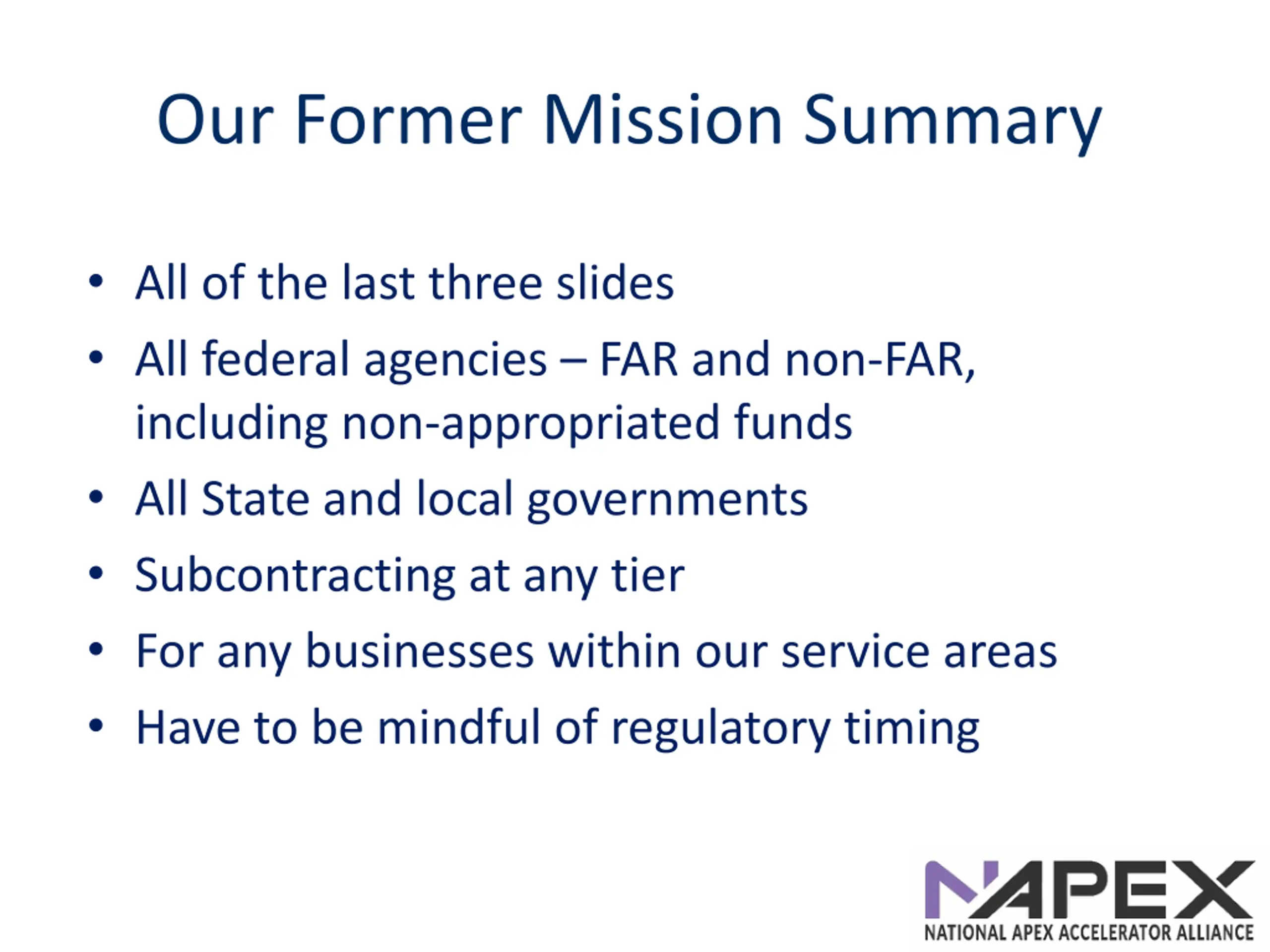 Our Former Mission Summary All of the last three slides All federal agencies FAR and non-FAR, including non-appropriated funds All State and local governments Subcontracting at any tier For any businesses within our service areas Have to be mindful of regulatory timing