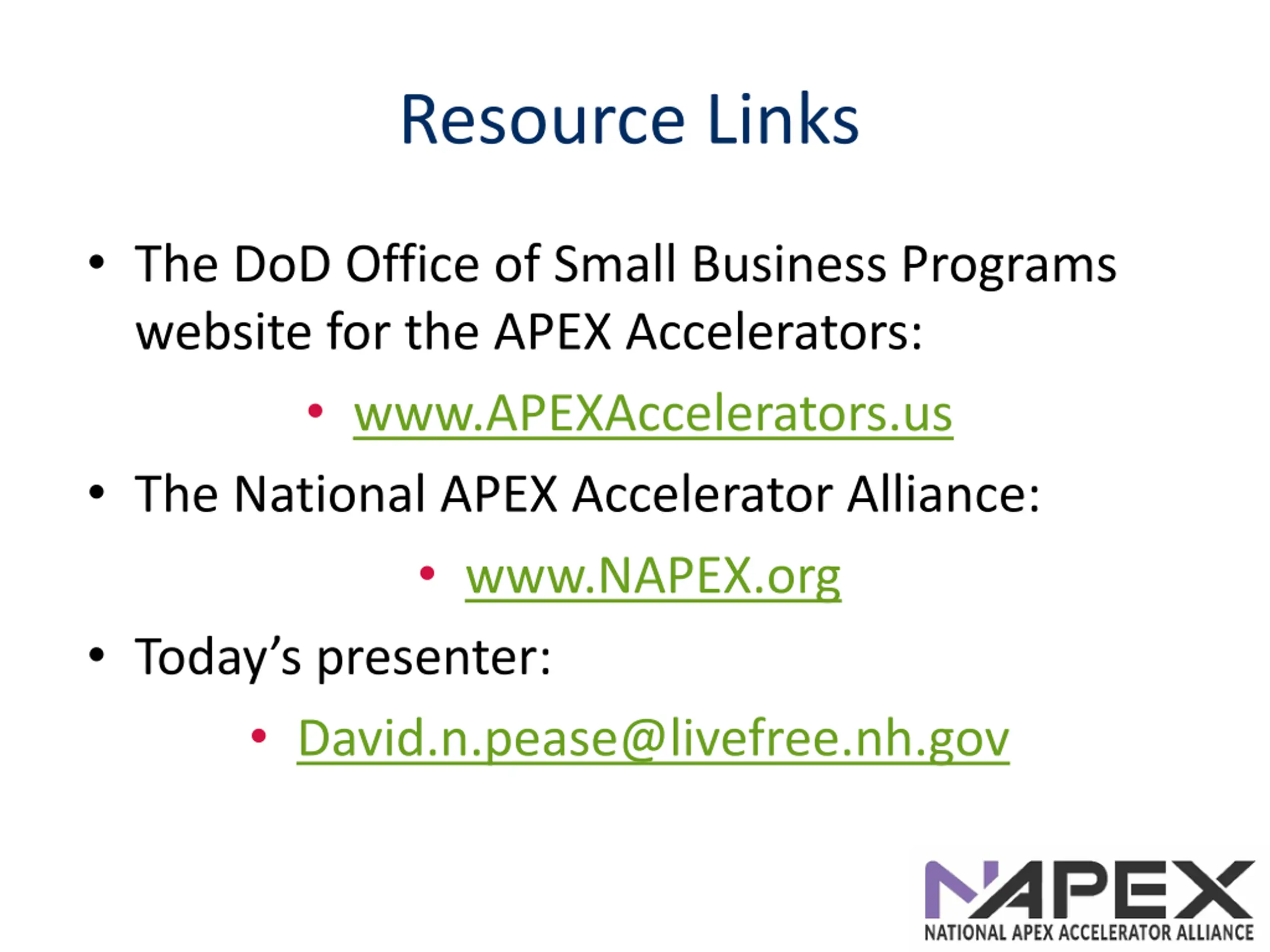 Resource Links The DoD Office of Small Business Programs website for the APEX Accelerators: www.APEXAccelerators.us The National APEX Accelerator Alliance: www.NAPEX.org Today s presenter: David.n.pease@livefree.nh.gov
