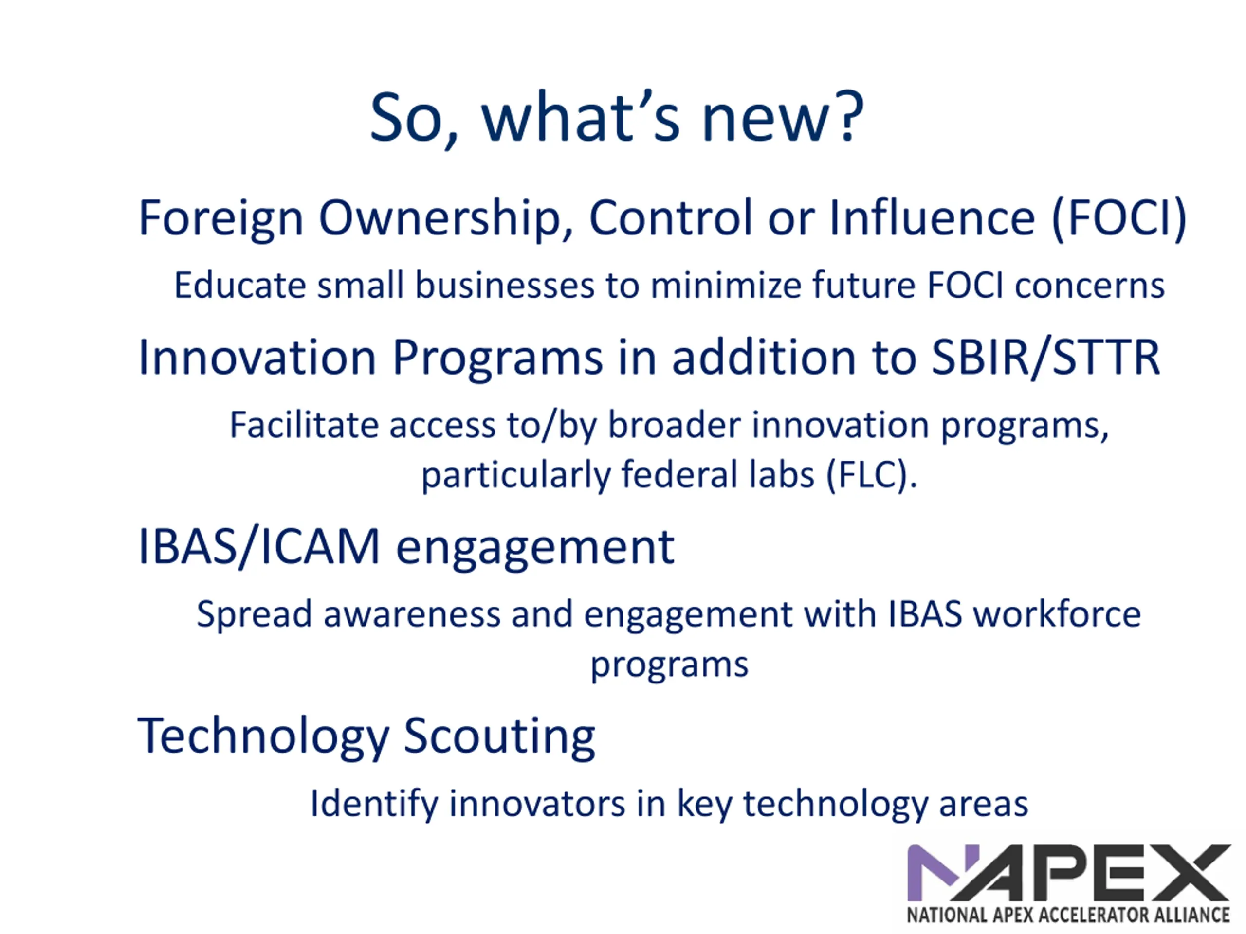 So, whats new? Foreign Ownership, Control or Influence (FOCI) Educate small businesses to minimize future FOCI concerns Innovation Programs in addition to SBIR/STTR Facilitate access to/by broader innovation programs, particularly federal labs (FLC). IBAS/ICAM engagement Spread awareness and engagement with IBAS workforce programs Technology Scouting Identify innovators in key technology areas