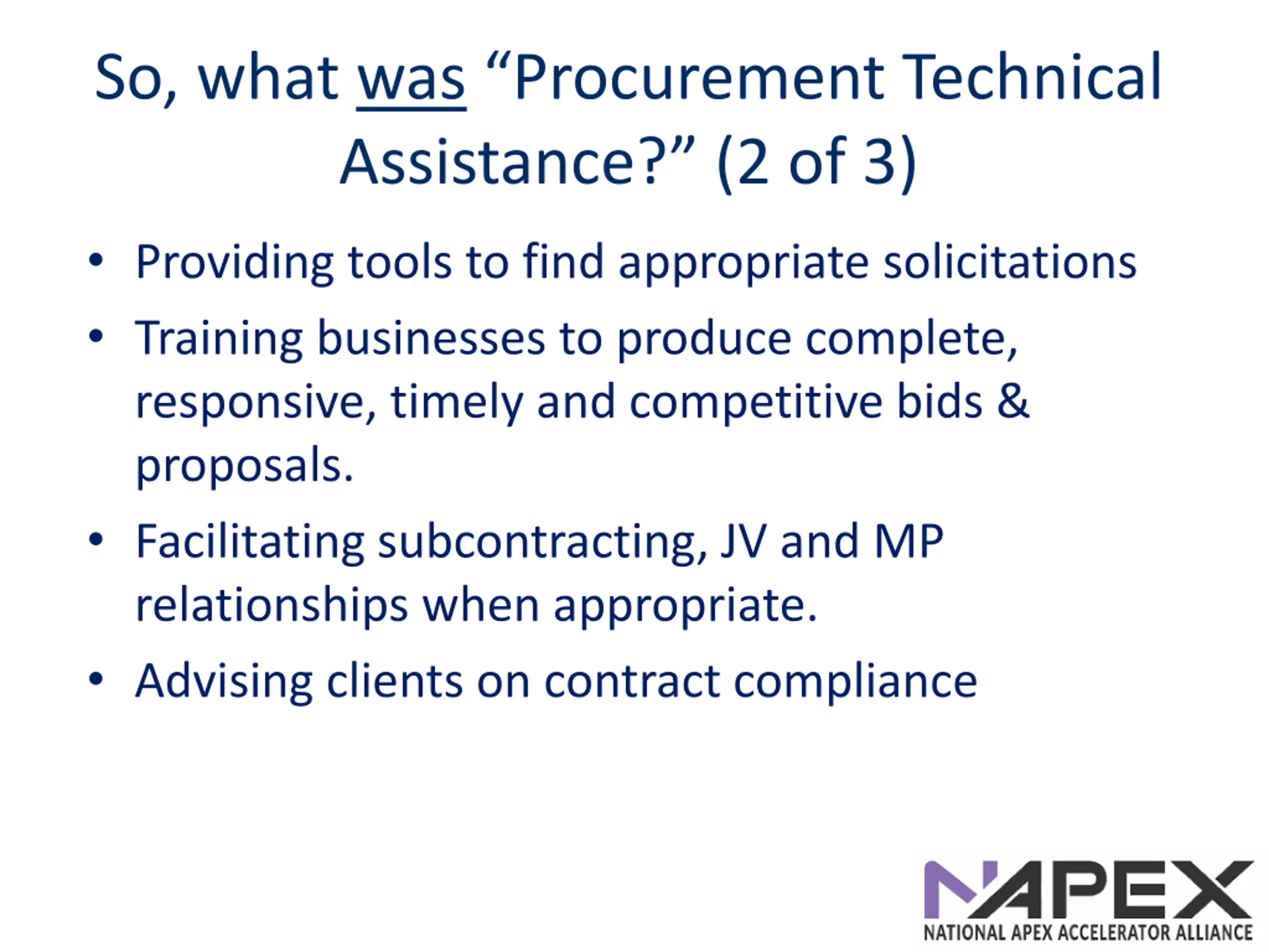 So, what was Procurement Technical Assistance? (2 of 3) Providing tools to find appropriate solicitations Training businesses to produce complete, responsive, timely and competitive bids & proposals. Facilitating subcontracting, JV and MP relationships when appropriate. Advising clients on contract compliance