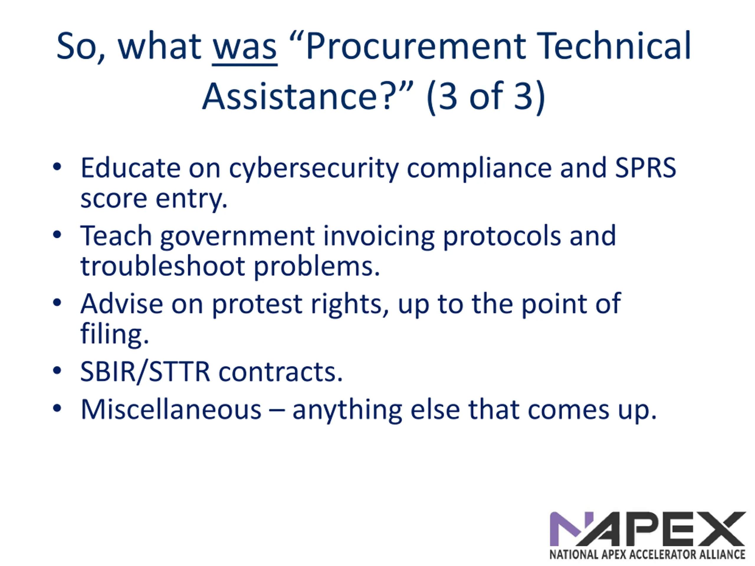 So, what was Procurement Technical Assistance? (3 of 3) Educate on cybersecurity compliance and SPRS score entry. Teach government invoicing protocols and troubleshoot problems. Advise on protest rights, up to the point of filing. SBIR/STTR contracts. Miscellaneous anything else that comes up.