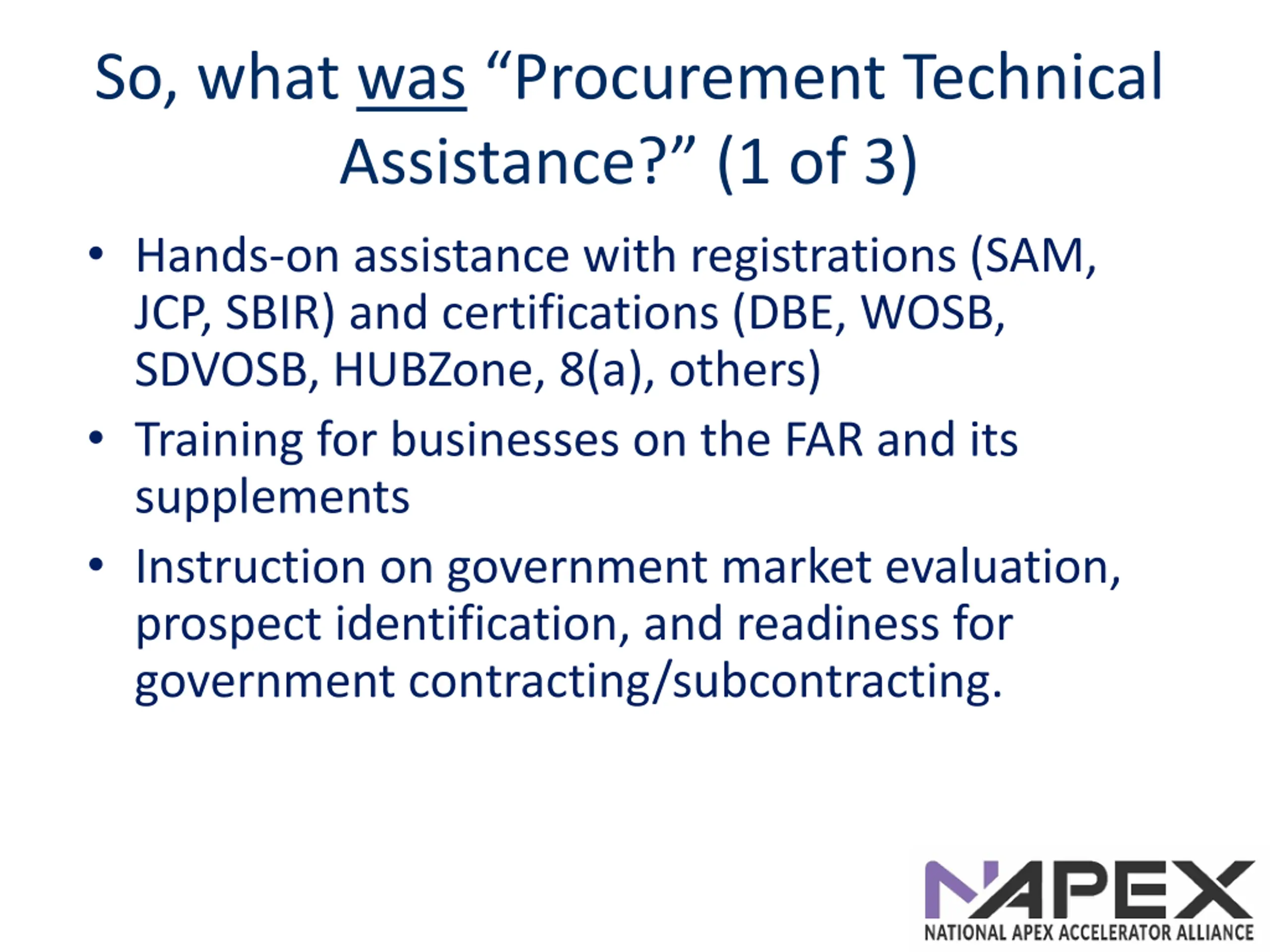 So, what was Procurement Technical Assistance? (1 of 3) Hands-on assistance with registrations (SAM, JCP, SBIR) and certifications (DBE, WOSB, SDVOSB, HUBZone, 8(a), others) Training for businesses on the FAR and its supplements Instruction on government market evaluation, prospect identification, and readiness for government contracting/subcontracting.