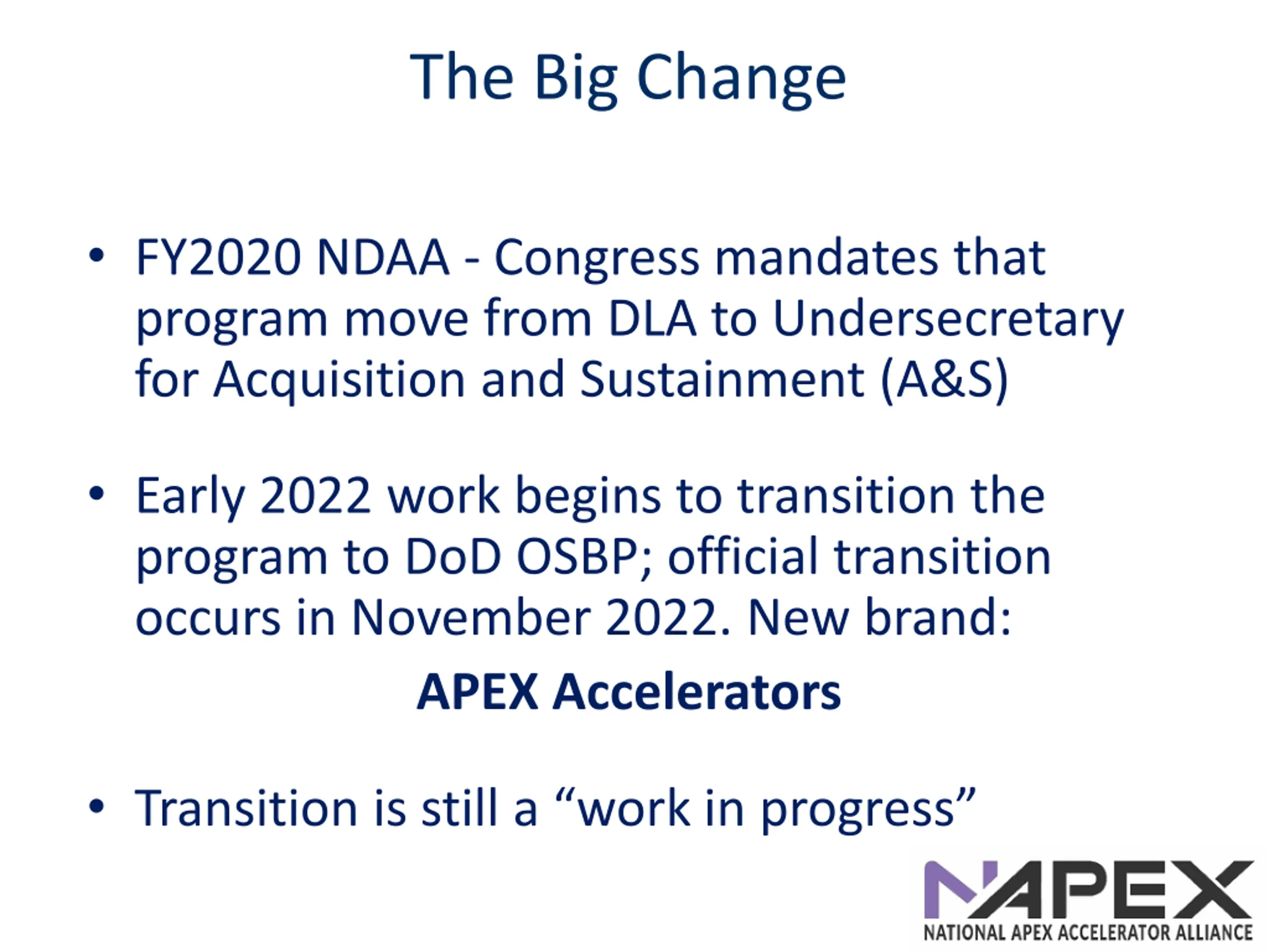 The Big Change FY2020 NDAA - Congress mandates that program move from DLA to Undersecretary for Acquisition and Sustainment (A&S) Early 2022 work begins to transition the program to DoD OSBP; official transition occurs in November 2022. New brand: APEX Accelerators Transition is still a work in progress