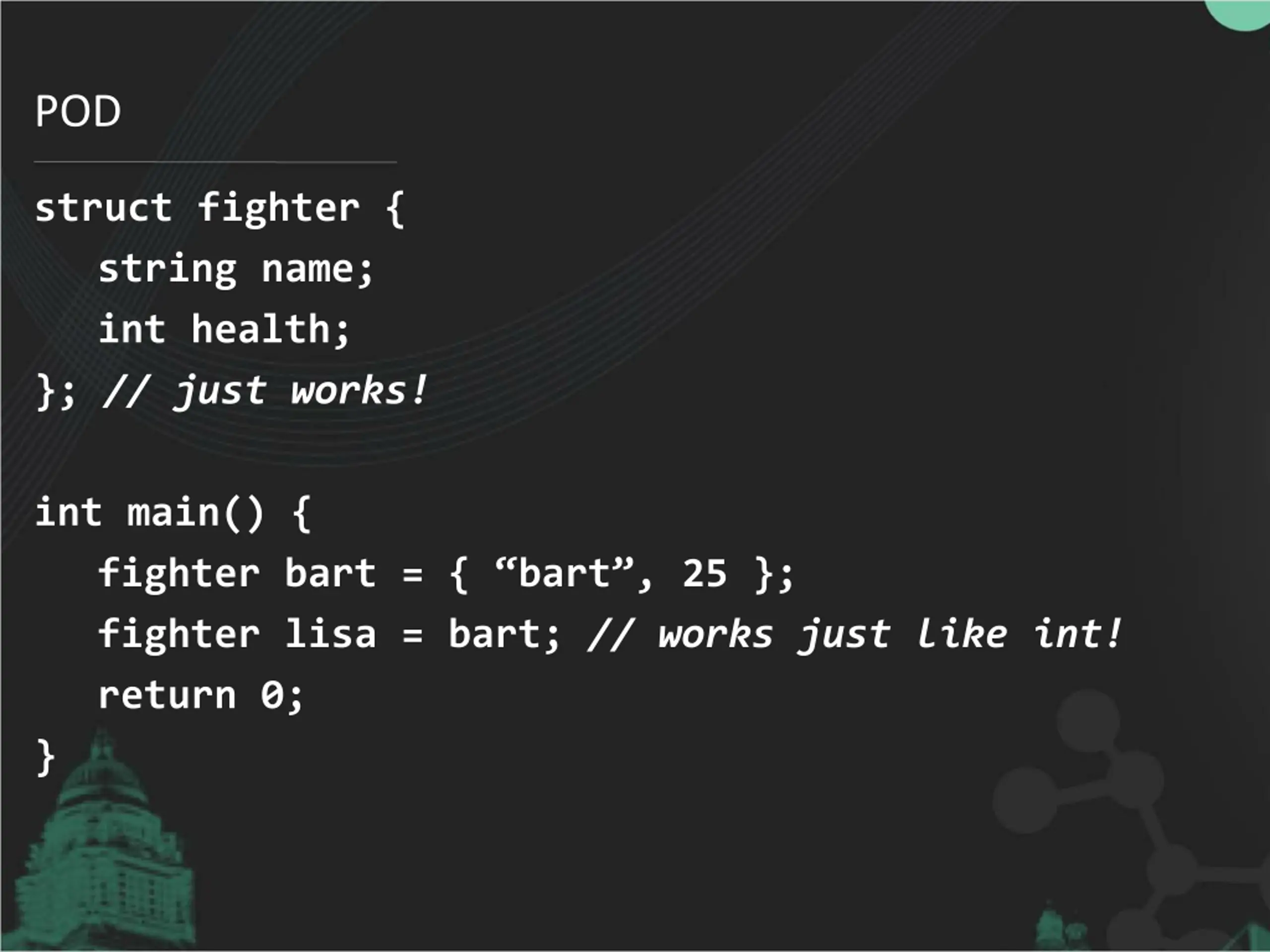 POD struct fighter { string name; int health; }; // just works! int main() { fighter bart = { bart , 25 }; fighter lisa = bart; // works just like int! return 0; }