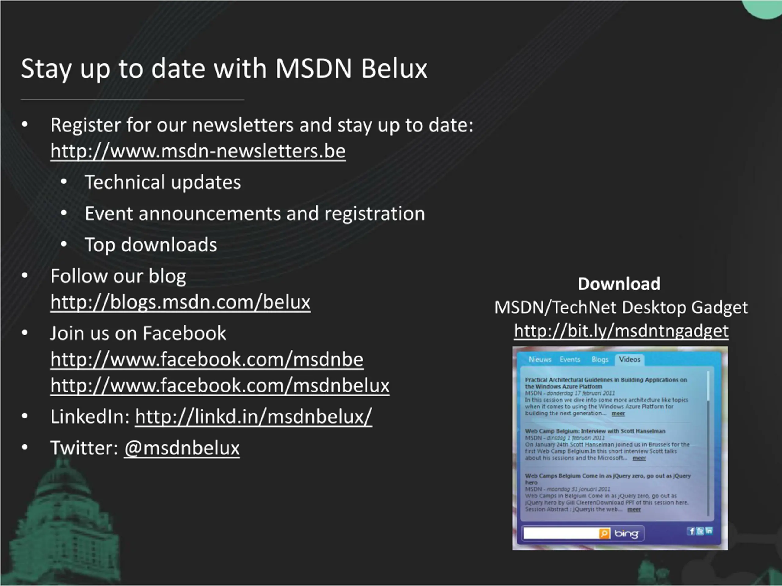 Stay up to date with MSDN Belux Register for our newsletters and stay up to date: http://www.msdn-newsletters.be Technical updates Event announcements and registration Top downloads Follow our blog http://blogs.msdn.com/belux Join us on Facebook http://www.facebook.com/msdnbe http://www.facebook.com/msdnbelux LinkedIn: http://linkd.in/msdnbelux/ Twitter: @msdnbelux Download MSDN/TechNet Desktop Gadget http://bit.ly/msdntngadget