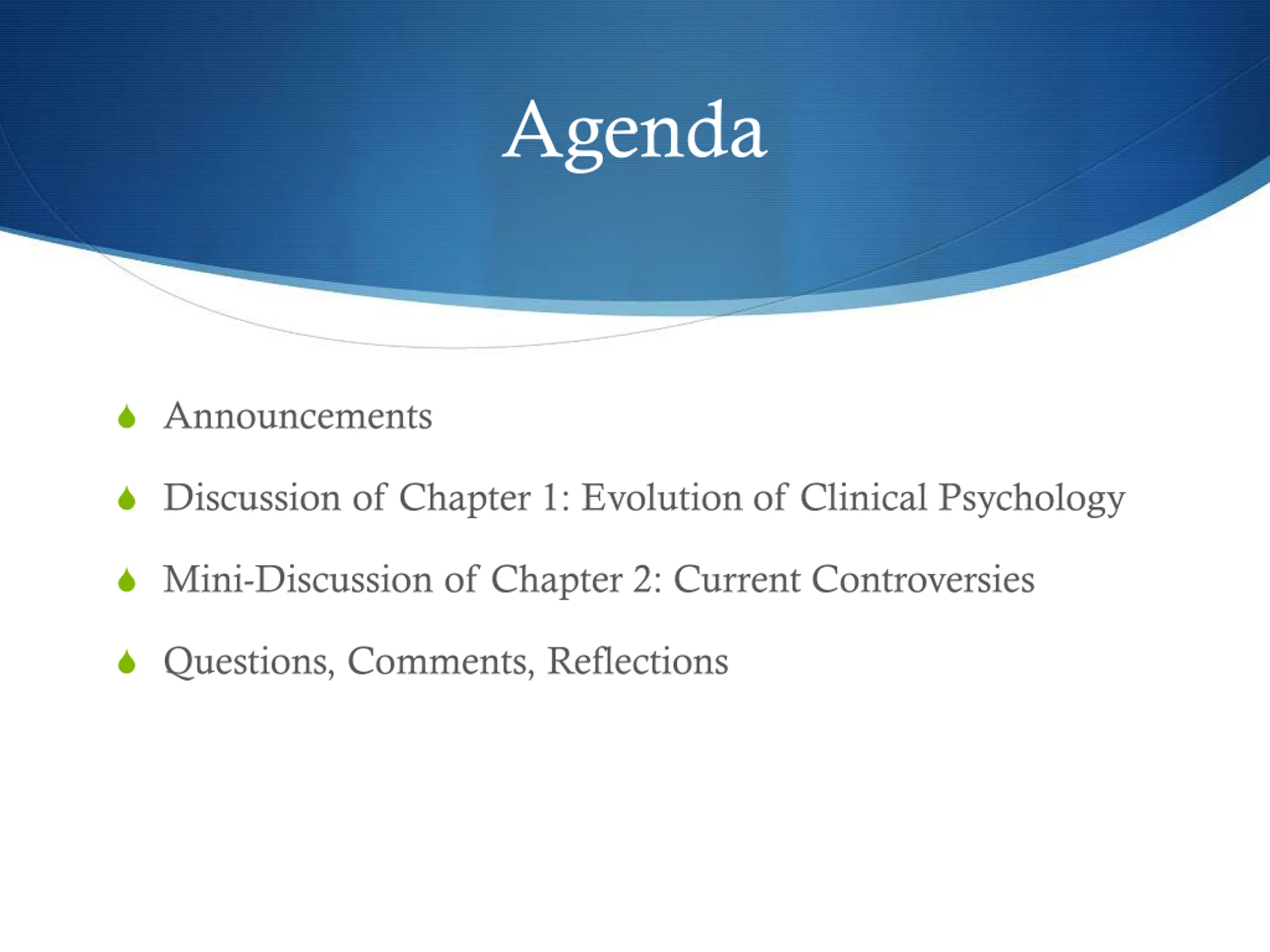 Agenda Announcements Discussion of Chapter 1: Evolution of Clinical Psychology Mini-Discussion of Chapter 2: Current Controversies Questions, Comments, Reflections