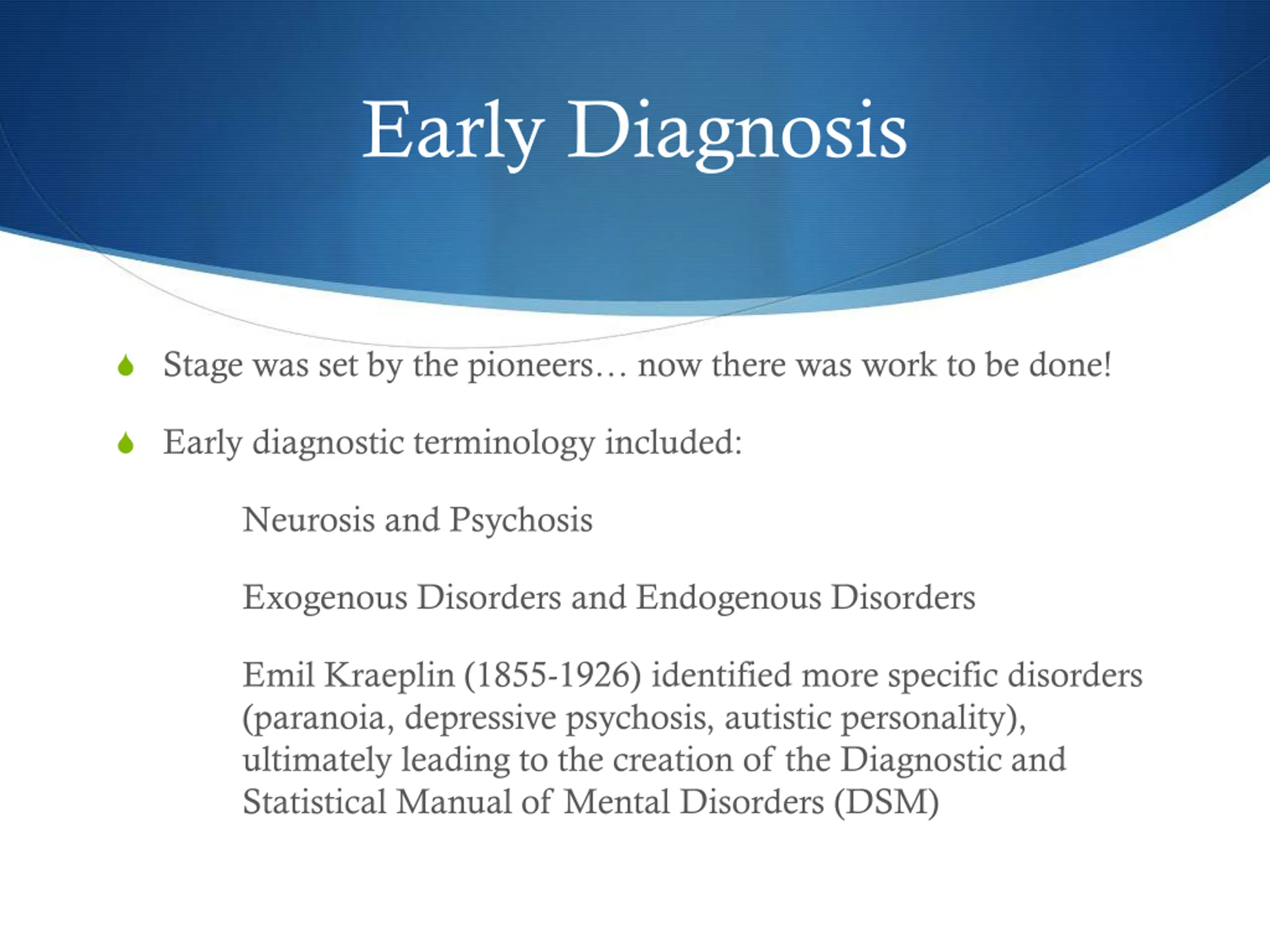 Early Diagnosis Stage was set by the pioneers now there was work to be done! Early diagnostic terminology included: Neurosis and Psychosis Exogenous Disorders and Endogenous Disorders Emil Kraeplin (1855-1926) identified more specific disorders (paranoia, depressive psychosis, autistic personality), ultimately leading to the creation of the Diagnostic and Statistical Manual of Mental Disorders (DSM)
