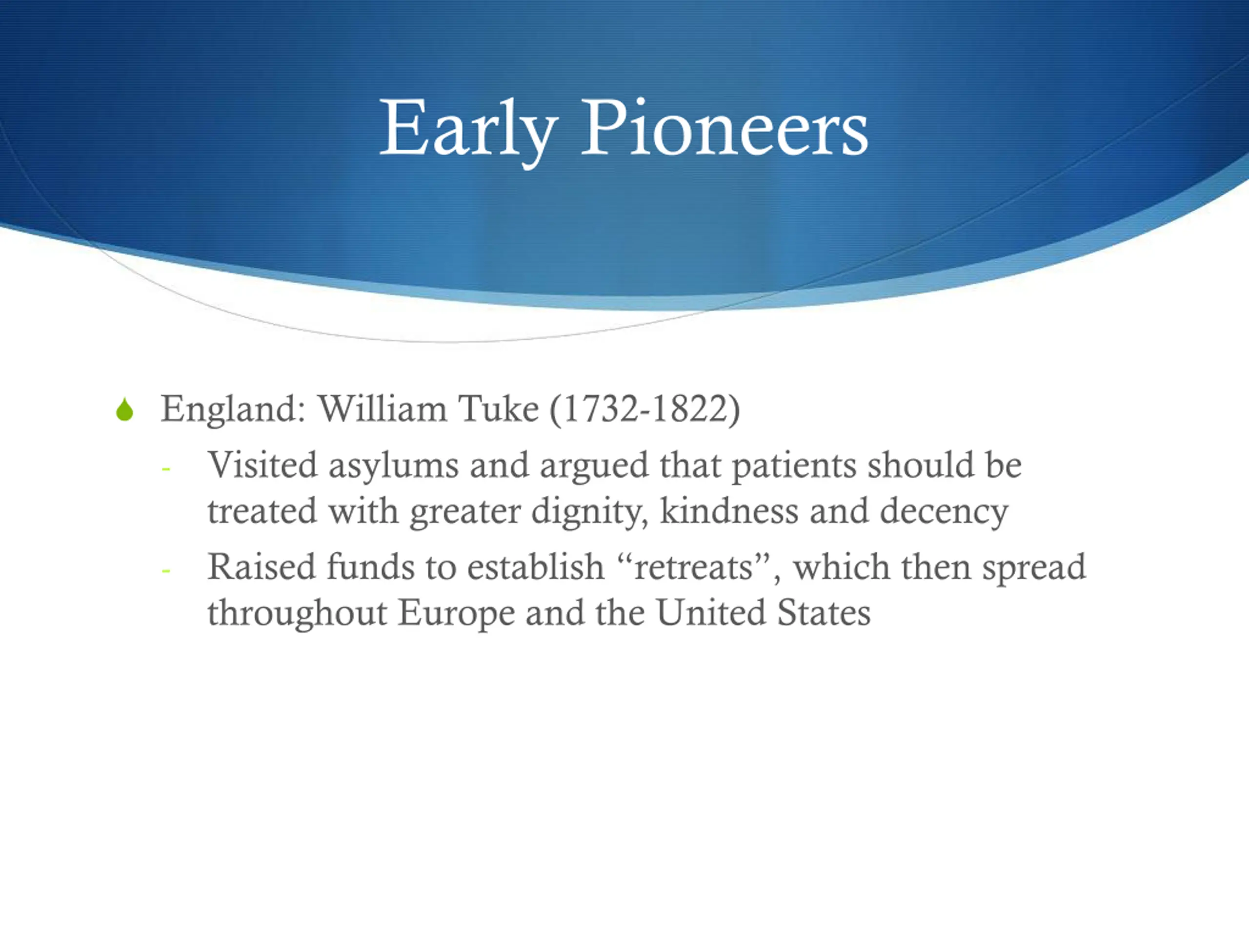 Early Pioneers England: William Tuke (1732-1822) - Visited asylums and argued that patients should be treated with greater dignity, kindness and decency - Raised funds to establish retreats , which then spread throughout Europe and the United States