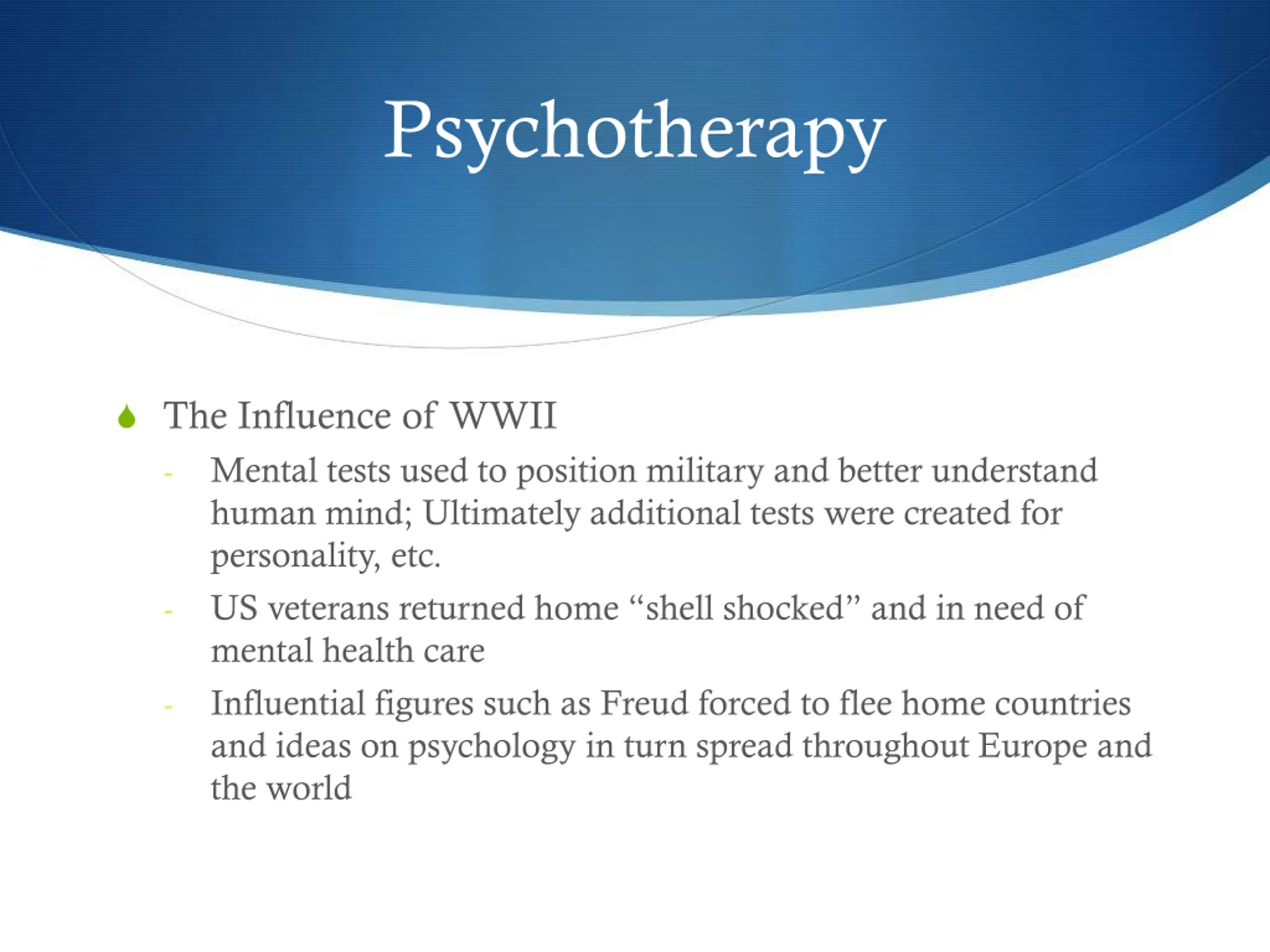 Psychotherapy The Influence of WWII - Mental tests used to position military and better understand human mind; Ultimately additional tests were created for personality, etc. - US veterans returned home shell shocked and in need of mental health care - Influential figures such as Freud forced to flee home countries and ideas on psychology in turn spread throughout Europe and the world