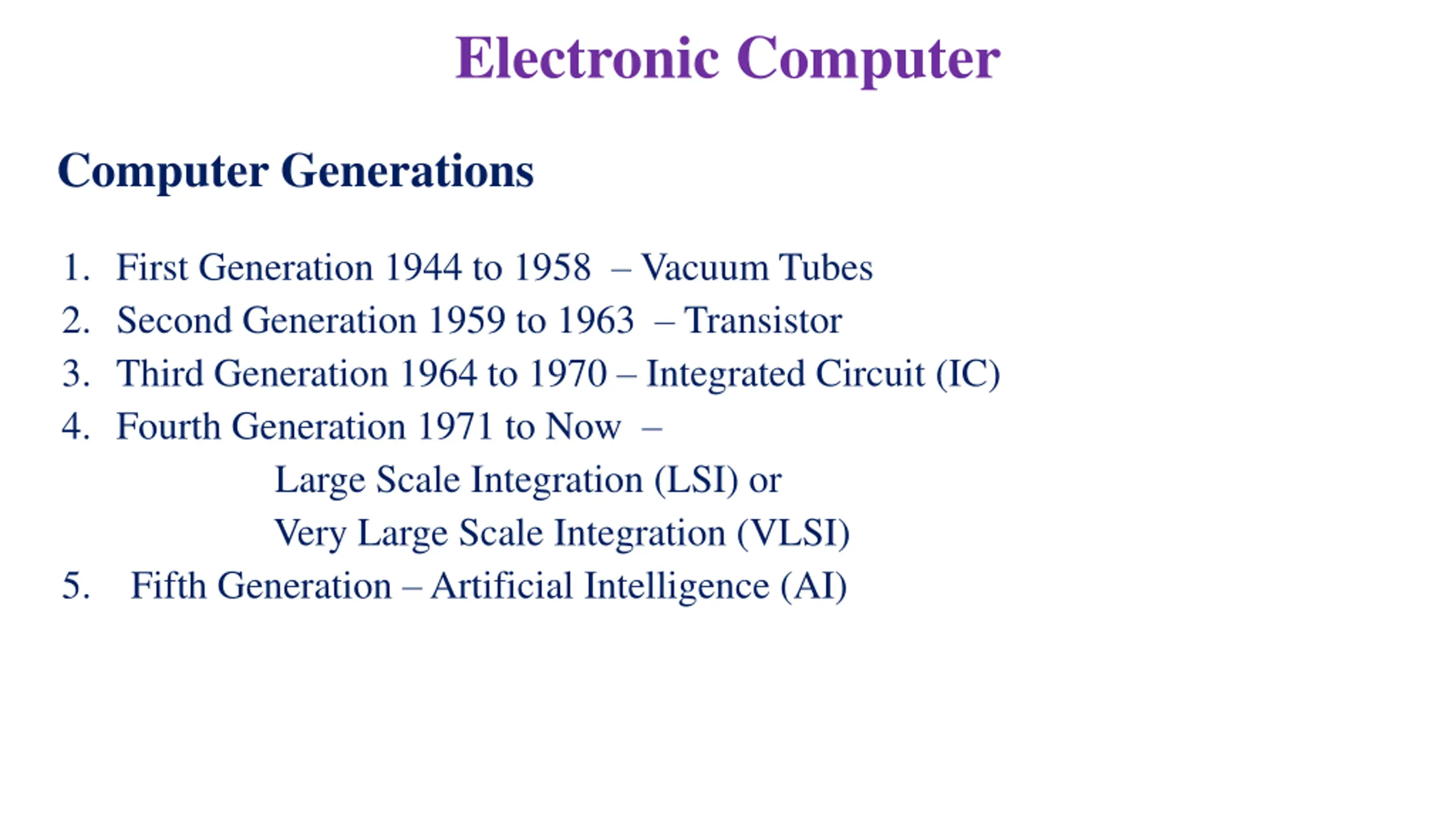 Electronic Computer Computer Generations 1. First Generation 1944 to 1958 Vacuum Tubes 2. Second Generation 1959 to 1963 Transistor 3. Third Generation 1964 to 1970 Integrated Circuit (IC) 4. Fourth Generation 1971 to Now Large Scale Integration (LSI) or Very Large Scale Integration (VLSI) 5. Fifth Generation Artificial Intelligence (AI)