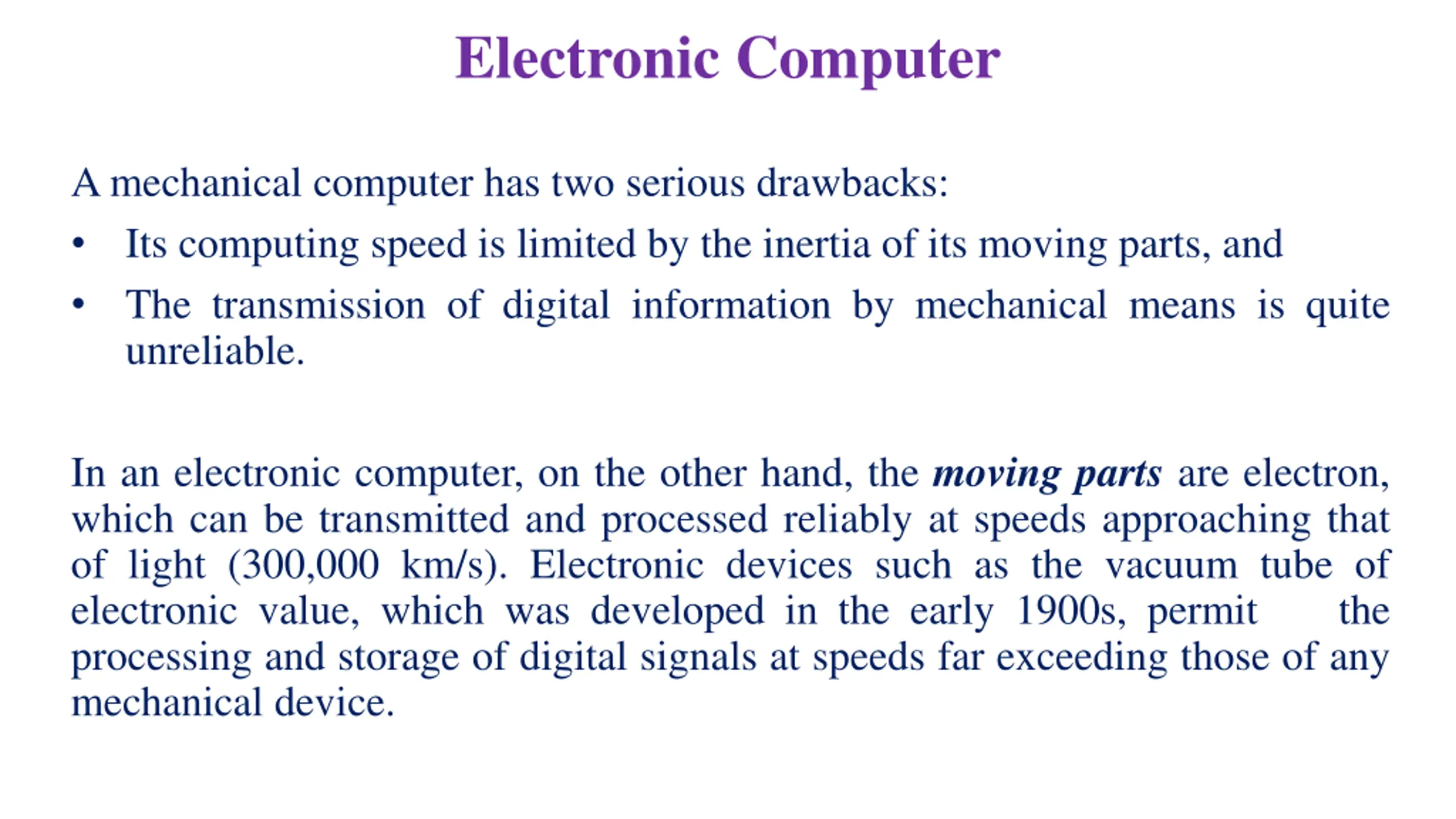Electronic Computer A mechanical computer has two serious drawbacks: Its computing speed is limited by the inertia of its moving parts, and The transmission of digital information by mechanical means is quite unreliable. In an electronic computer, on the other hand, the moving parts are electron, which can be transmitted and processed reliably at speeds approaching that of light (300,000 km/s). Electronic devices such as the vacuum tube of electronic value, which was developed in the early 1900s, permit the processing and storage of digital signals at speeds far exceeding those of any mechanical device.