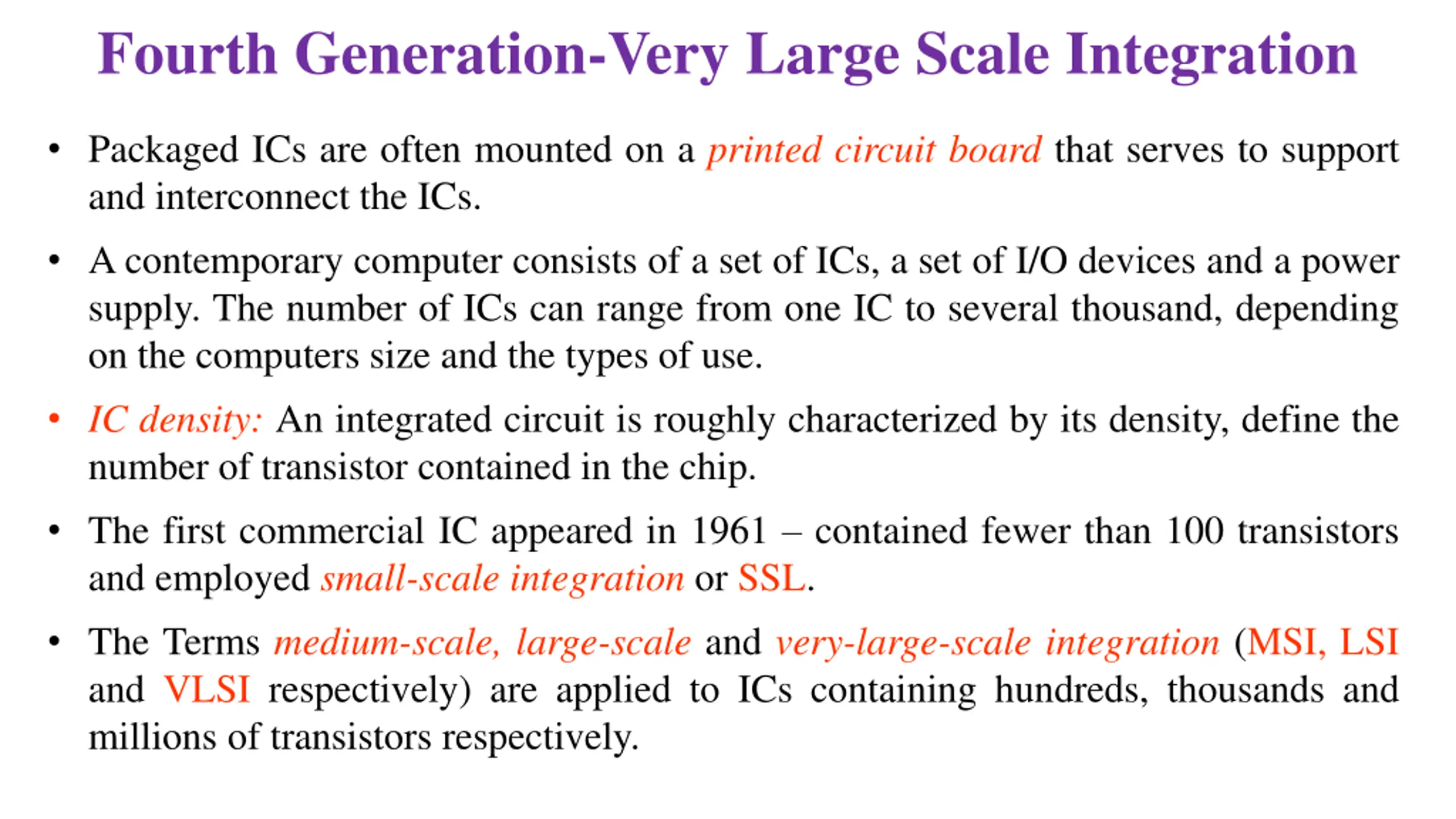 Fourth Generation-Very Large Scale Integration Packaged ICs are often mounted on a printed circuit board that serves to support and interconnect the ICs. A contemporary computer consists of a set of ICs, a set of I/O devices and a power supply. The number of ICs can range from one IC to several thousand, depending on the computers size and the types of use. IC density: An integrated circuit is roughly characterized by its density, define the number of transistor contained in the chip. The first commercial IC appeared in 1961 contained fewer than 100 transistors and employed small-scale integration or SSL. The Terms medium-scale, large-scale and very-large-scale integration (MSI, LSI and VLSI respectively) are applied to ICs containing hundreds, thousands and millions of transistors respectively.