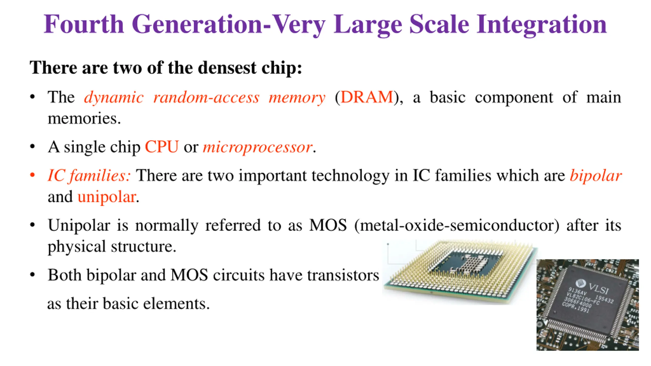 Fourth Generation-Very Large Scale Integration There are two of the densest chip: The dynamic random-access memory (DRAM), a basic component of main memories. A single chip CPU or microprocessor. IC families: There are two important technology in IC families which are bipolar and unipolar. Unipolar is normally referred to as MOS (metal-oxide-semiconductor) after its physical structure. Both bipolar and MOS circuits have transistors as their basic elements.