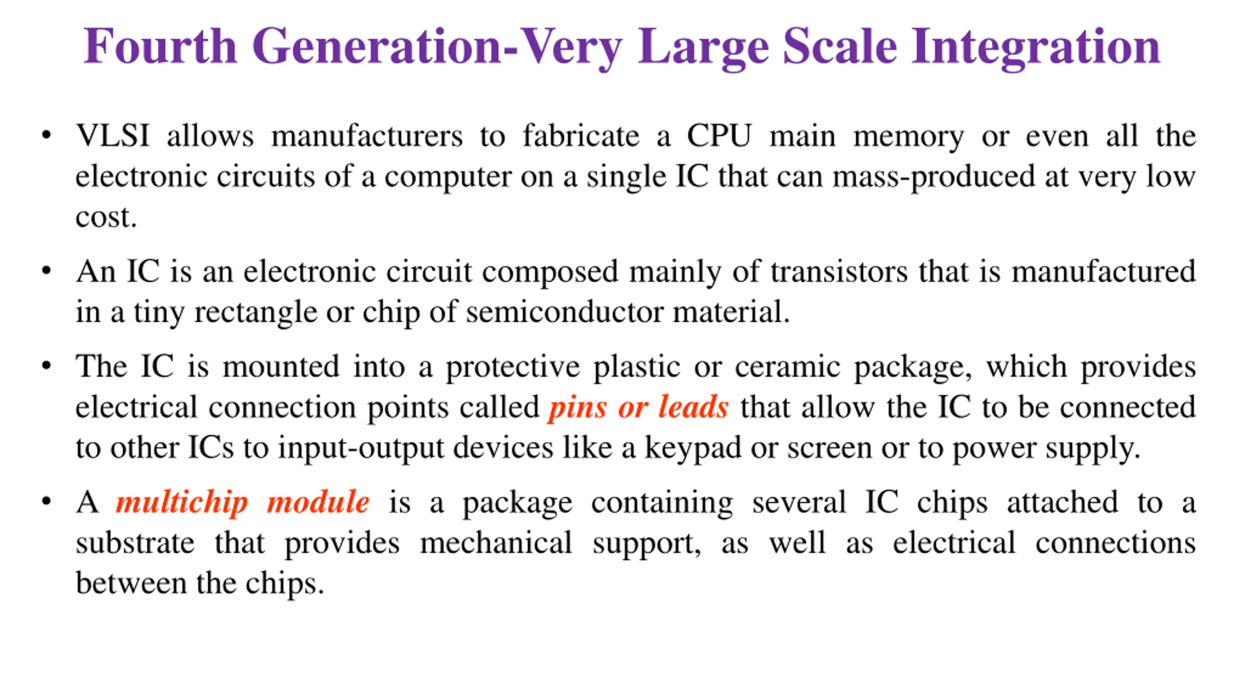 Fourth Generation-Very Large Scale Integration VLSI allows manufacturers to fabricate a CPU main memory or even all the electronic circuits of a computer on a single IC that can mass-produced at very low cost. An IC is an electronic circuit composed mainly of transistors that is manufactured in a tiny rectangle or chip of semiconductor material. The IC is mounted into a protective plastic or ceramic package, which provides electrical connection points called pins or leads that allow the IC to be connected to other ICs to input-output devices like a keypad or screen or to power supply. A multichip module is a package containing several IC chips attached to a substrate that provides mechanical support, as well as electrical connections between the chips.