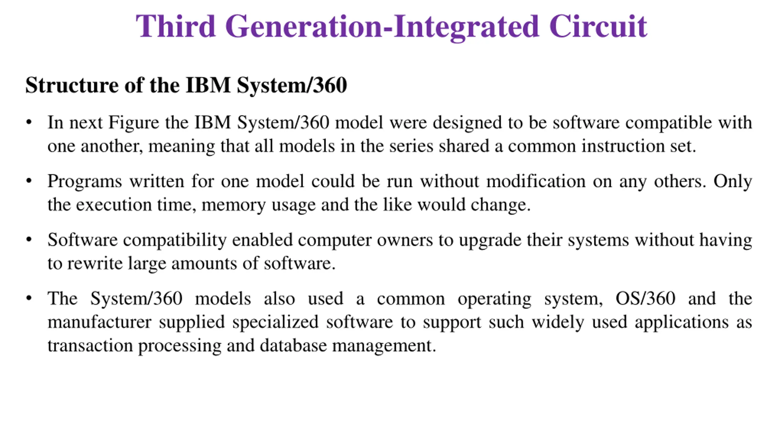 Third Generation-Integrated Circuit Structure of the IBM System/360 In next Figure the IBM System/360 model were designed to be software compatible with one another, meaning that all models in the series shared a common instruction set. Programs written for one model could be run without modification on any others. Only the execution time, memory usage and the like would change. Software compatibility enabled computer owners to upgrade their systems without having to rewrite large amounts of software. The System/360 models also used a common operating system, OS/360 and the manufacturer supplied specialized software to support such widely used applications as transaction processing and database management.