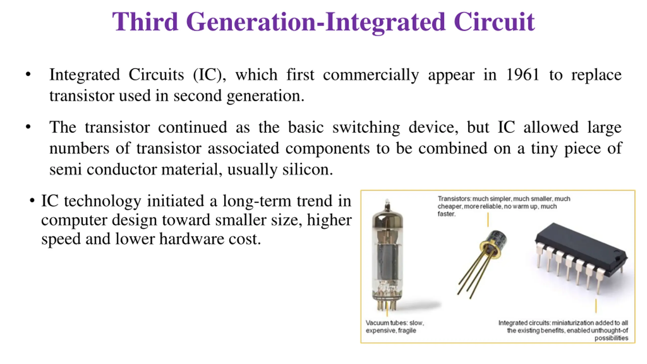 Third Generation-Integrated Circuit Integrated Circuits (IC), which first commercially appear in 1961 to replace transistor used in second generation. The transistor continued as the basic switching device, but IC allowed large numbers of transistor associated components to be combined on a tiny piece of semi conductor material, usually silicon. IC technology initiated a long-term trend in computer design toward smaller size, higher speed and lower hardware cost.