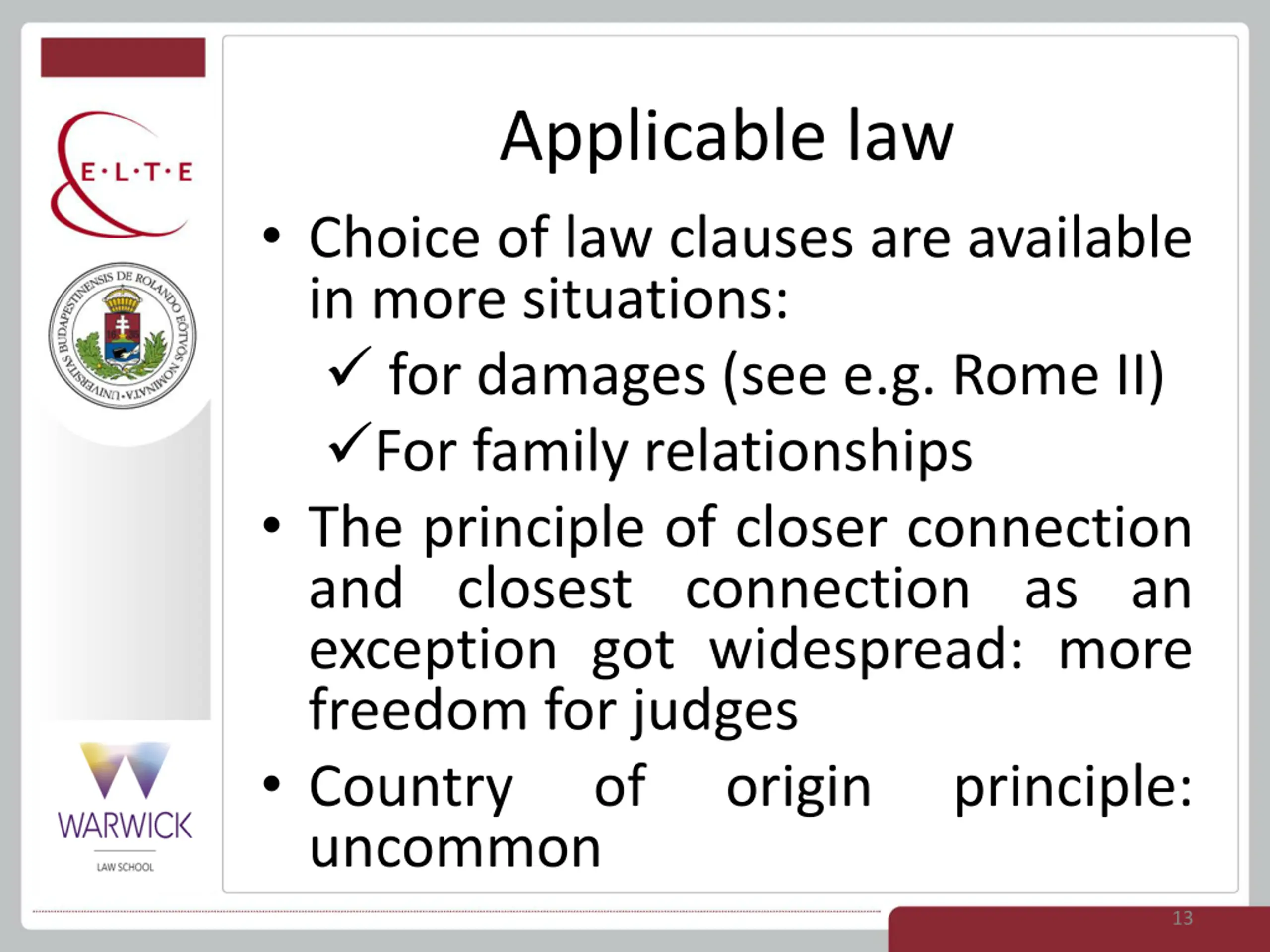 Applicable law Choice of law clauses are available in more situations: for damages (see e.g. Rome II) For family relationships The principle of closer connection and closest connection as an exception got widespread: more freedom for judges Country of origin uncommon principle: 13