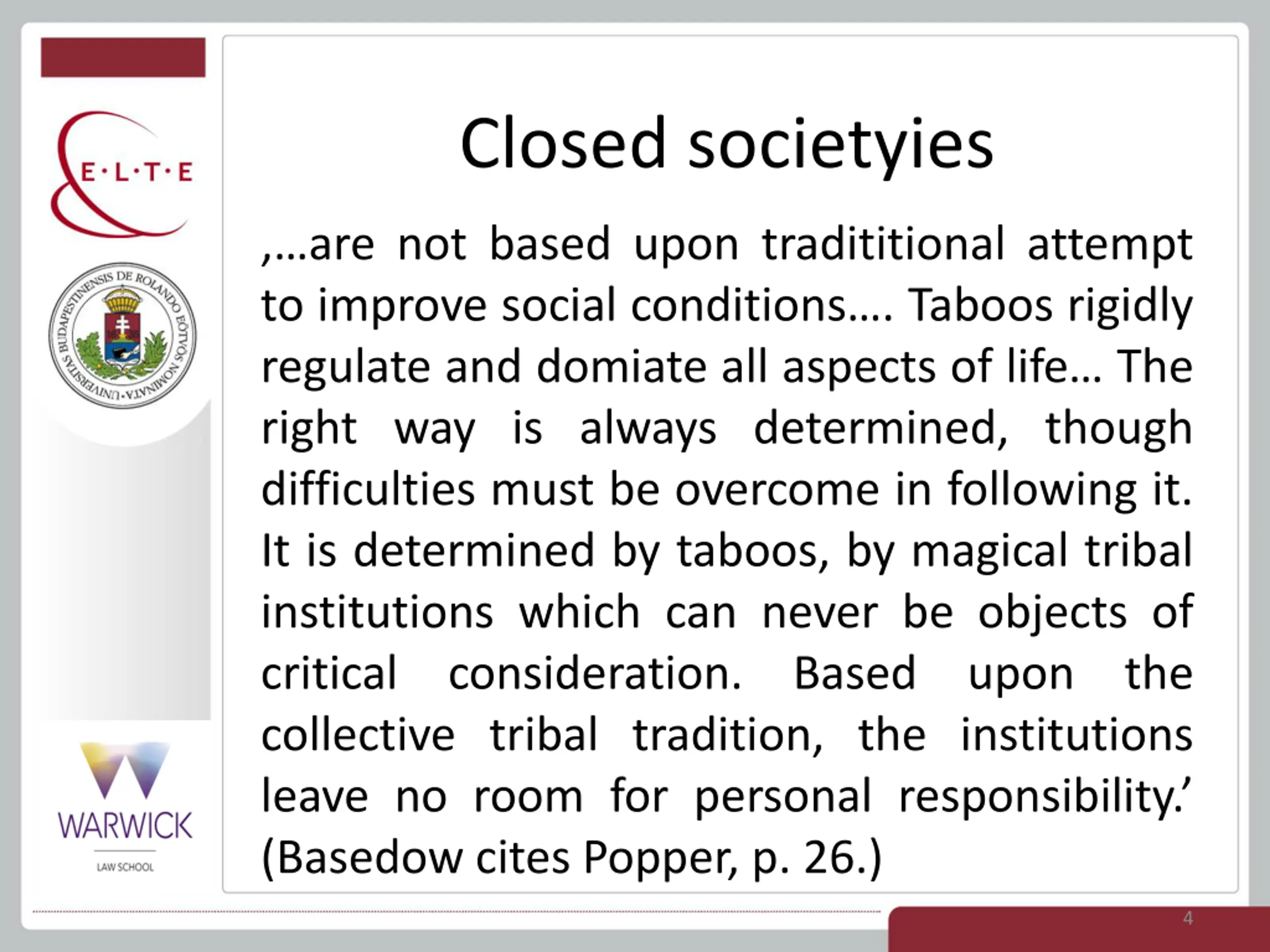 Closed societyies are not based upon tradititional attempt to improve social conditions . Taboos rigidly regulate and domiate all aspects of life The right way is always determined, though difficulties must be overcome in following it. It is determined by taboos, by magical tribal institutions which can never be objects of critical consideration. collective tribal tradition, the institutions leave no room for personal responsibility. (Basedow cites Popper, p. 26.) Based upon the 4